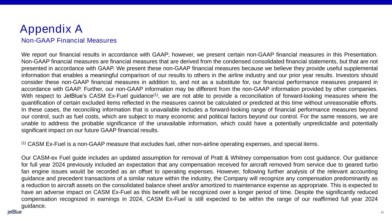 10 Outlook Summary (1) Prior full year guidance as of January 30, 2024. (2) See Appendix A for further details on Non-GAAP measures. (3) Includes the impact from the pilot union agreement of approximately two points for the full year 2024. (4) See Appendix A for more details on Pratt & Whitney compensation update. (5) Fuel hedged 27% for 2Q24; 16% for FY24. (6) Fuel price based on forward curve as of April 12, 2024. Includes fuel taxes, hedges, and other fuel fees. Guidance Estimated 2Q 2024 Estimated FY 2024 Available Seat Miles (ASMs) Year-over-Year (5.0%) – (2.0%) Down low single digits (unchanged)(1) Revenue Year-over-Year (10.5%) – (6.5%) Down low single digits (previously ~flat)(1) CASM ex-Fuel(2), (3), (4) Year-over-Year 5.5% – 7.5% Up mid-to-high single digits (unchanged)(1) Fuel Price per Gallon(5), (6) $2.98 – $3.13 - Capital Expenditures ~$550 million ~$1.6 billion (unchanged)(1)