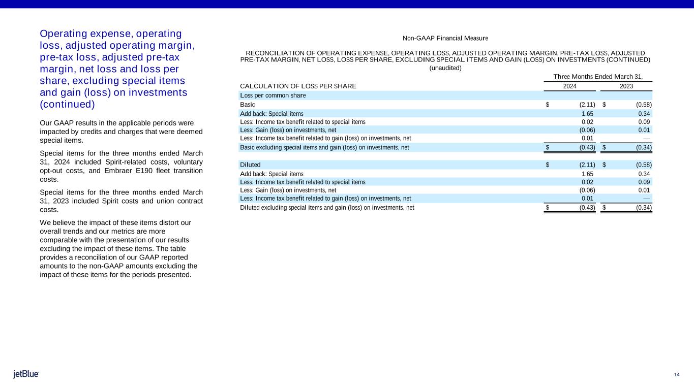 13 Operating expense, operating loss, adjusted operating margin, pre-tax loss, adjusted pre-tax margin, net loss and loss per share, excluding special items and gain (loss) on investments Our GAAP results in the applicable periods were impacted by credits and charges that were deemed special items. Special items for the three months ended March 31, 2024 included Spirit-related costs, voluntary opt-out costs, and Embraer E190 fleet transition costs. Special items for the three months ended March 31, 2023 included Spirit costs and union contract costs. Certain gains and losses on our investments were also excluded from our 2024 and 2023 GAAP results. We believe the impact of these items distort our overall trends and our metrics are more comparable with the presentation of our results excluding the impact of these items. The table provides a reconciliation of our GAAP reported amounts to the non-GAAP amounts excluding the impact of these items for the periods presented. Non-GAAP Financial Measure RECONCILIATION OF OPERATING EXPENSE, OPERATING LOSS, ADJUSTED OPERATING MARGIN, PRE-TAX LOSS, ADJUSTED PRE-TAX MARGIN, NET LOSS, LOSS PER SHARE, EXCLUDING SPECIAL ITEMS AND GAIN (LOSS) ON INVESTMENTS (unaudited, in millions) Three Months Ended March 31, 2024 2023 Total operating revenues $ 2,209 $ 2,328 RECONCILIATION OF OPERATING EXPENSE Total operating expenses $ 2,928 $ 2,570 Less: Special items 562 112 Total operating expenses excluding special items $ 2,366 $ 2,458 Percent change (3.7) % RECONCILIATION OF OPERATING LOSS Operating loss $ (719) $ (242) Add back: Special items 562 112 Operating loss excluding special items $ (157) $ (130) RECONCILIATION OF ADJUSTED OPERATING MARGIN Operating margin (32.6)% (10.4)% Operating loss excluding special items $ (157) $ (130) Total operating revenues 2,209 2,328 Adjusted operating margin (7.1)% (5.6)% RECONCILIATION OF PRE-TAX LOSS Loss before income taxes $ (767) $ (266) Add back: Special items 562 112 Less: Gain (loss) on investments, net (22) 3 Loss before income taxes excluding special items and gain (loss) on investments, net $ (183) $ (157) RECONCILIATION OF ADJUSTED PRE-TAX MARGIN Pre-tax margin (34.7)% (11.4)% Loss before income taxes excluding special items $ (183) $ (157) Total operating revenues 2,209 2,328 Adjusted pre-tax margin (8.3)% (6.8)% RECONCILIATION OF NET LOSS Net loss $ (716) $ (192) Add back: Special items 562 112 Less: Income tax benefit related to special items 7 29 Less: Gain (loss) on investments, net (22) 3 Less: Income tax benefit (expense) related to gain (loss) on investments, net 6 (1) Net loss excluding special items and gain (loss) on investments, net $ (145) $ (111)
