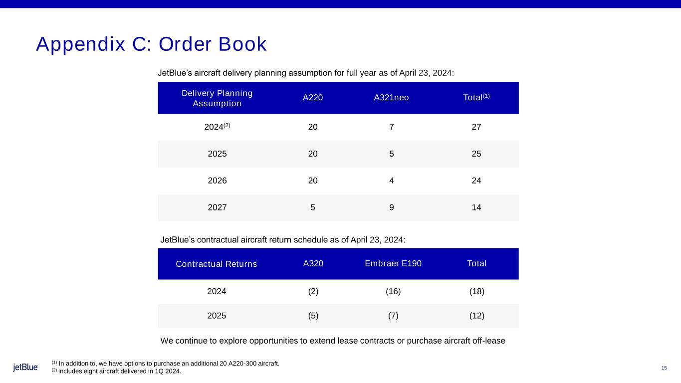 15 Delivery Planning Assumption A220 A321neo Total(1) 2024(2) 20 7 27 2025 20 5 25 2026 20 4 24 2027 5 9 14 Appendix C: Order Book Contractual Returns A320 Embraer E190 Total 2024 (2) (16) (18) 2025 (5) (7) (12) We continue to explore opportunities to extend lease contracts or purchase aircraft off-lease (1) In addition to, we have options to purchase an additional 20 A220-300 aircraft. (2) Includes eight aircraft delivered in 1Q 2024. JetBlue’s aircraft delivery planning assumption for full year as of April 23, 2024: JetBlue’s contractual aircraft return schedule as of April 23, 2024: