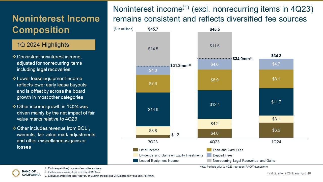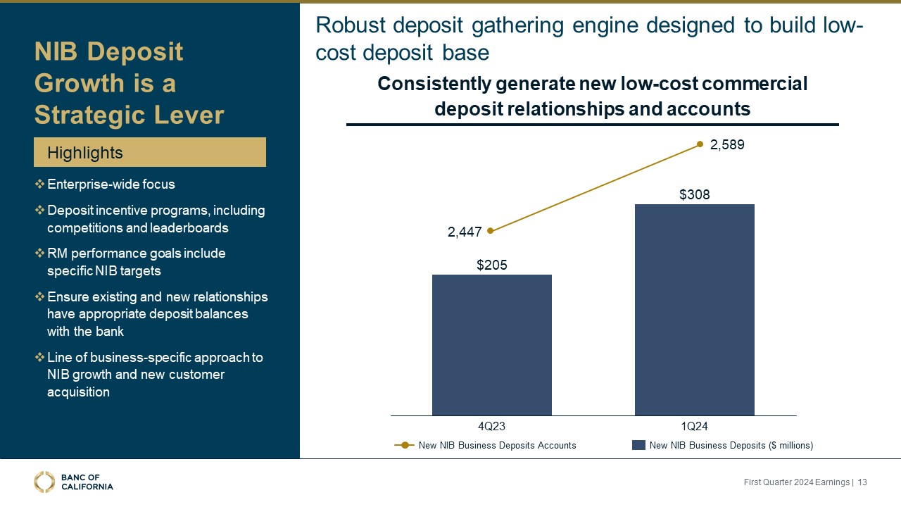 Improved overall deposit mix, with noninterest-bearing deposits increasing over $59 million in the first quarter and the noninterest-bearing percentage of total deposits increasing from 26% at December 31, 2023 to 27% at March 31,
