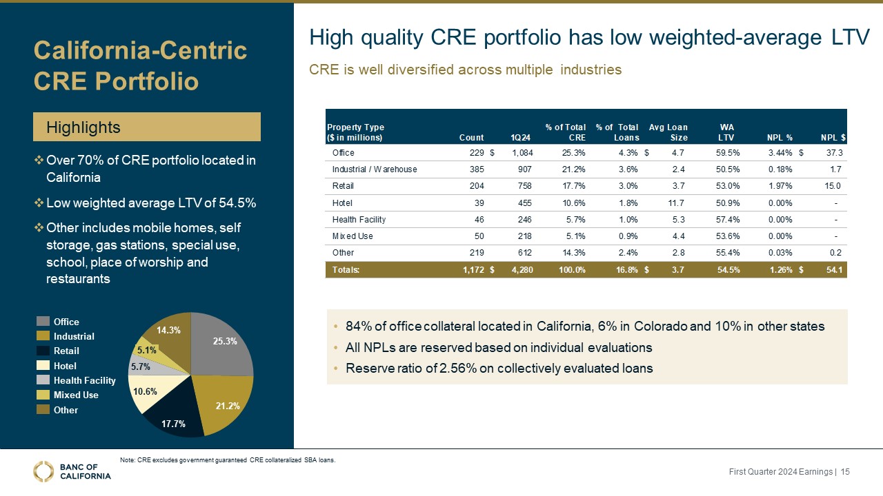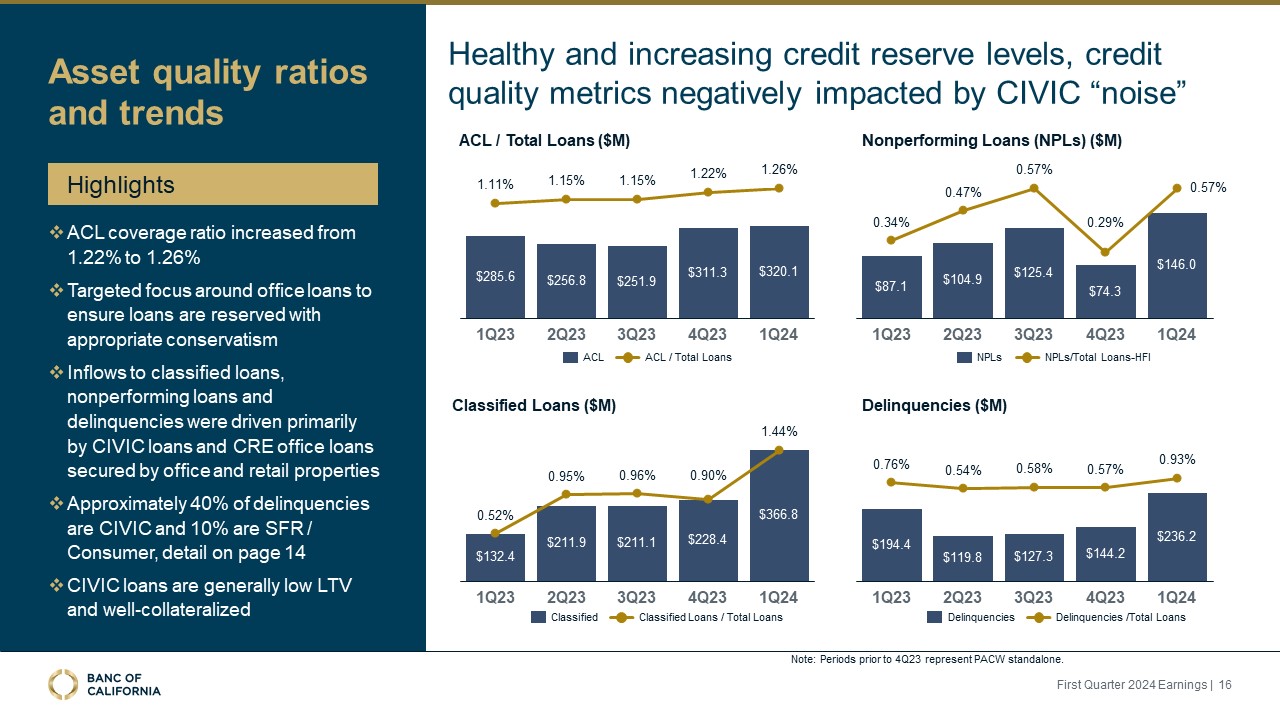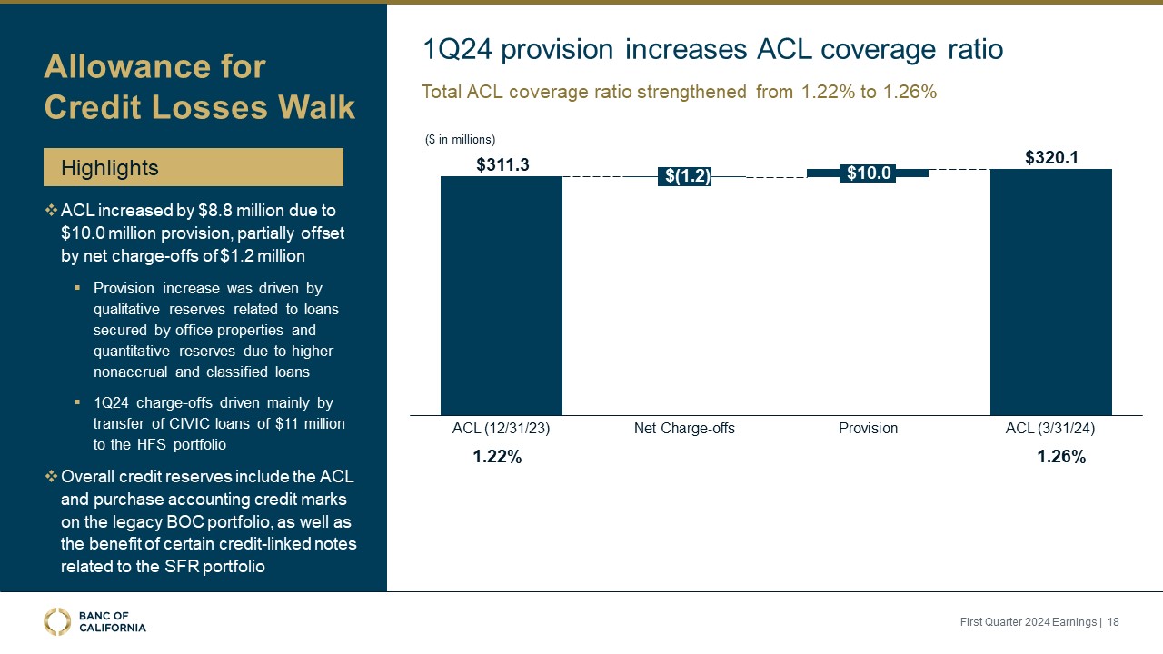 Allowance for credit losses of 1.26% at March 31, 2024, up from 1.22% at December 31, 2023, after a first quarter provision for credit losses of $10.0 million.