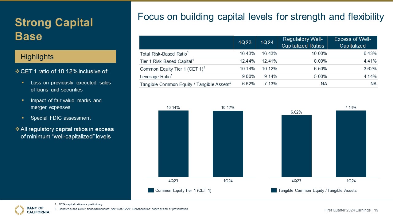 Strong capital ratios well above the regulatory thresholds for "well capitalized" banks at March 31, 2024, including an estimated 16.43% Total risk-based capital ratio, 12.41% Tier 1 capital ratio, 10.12% CET1 capital ratio, and 9.14% Tier 1 leverage ratio.