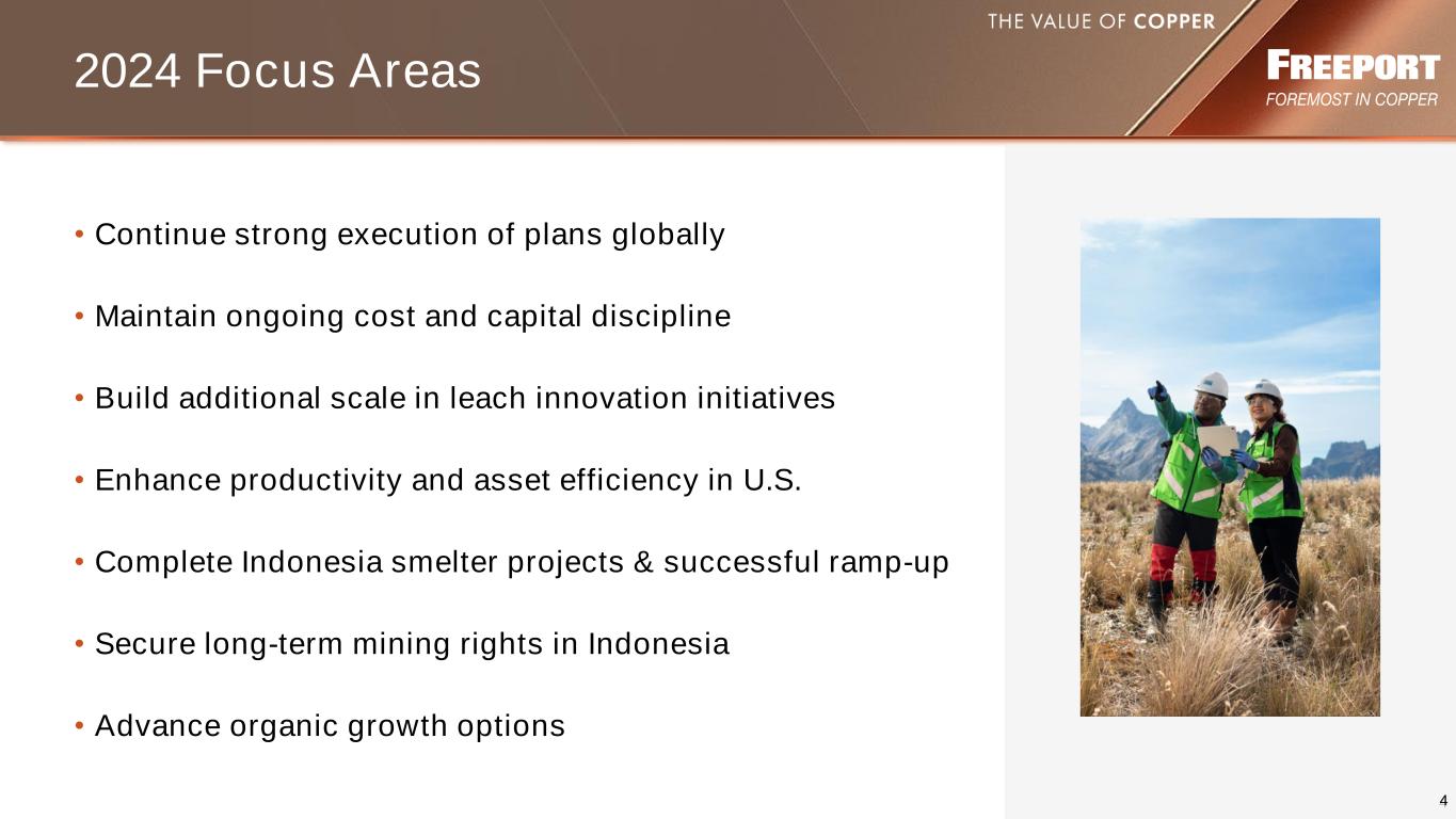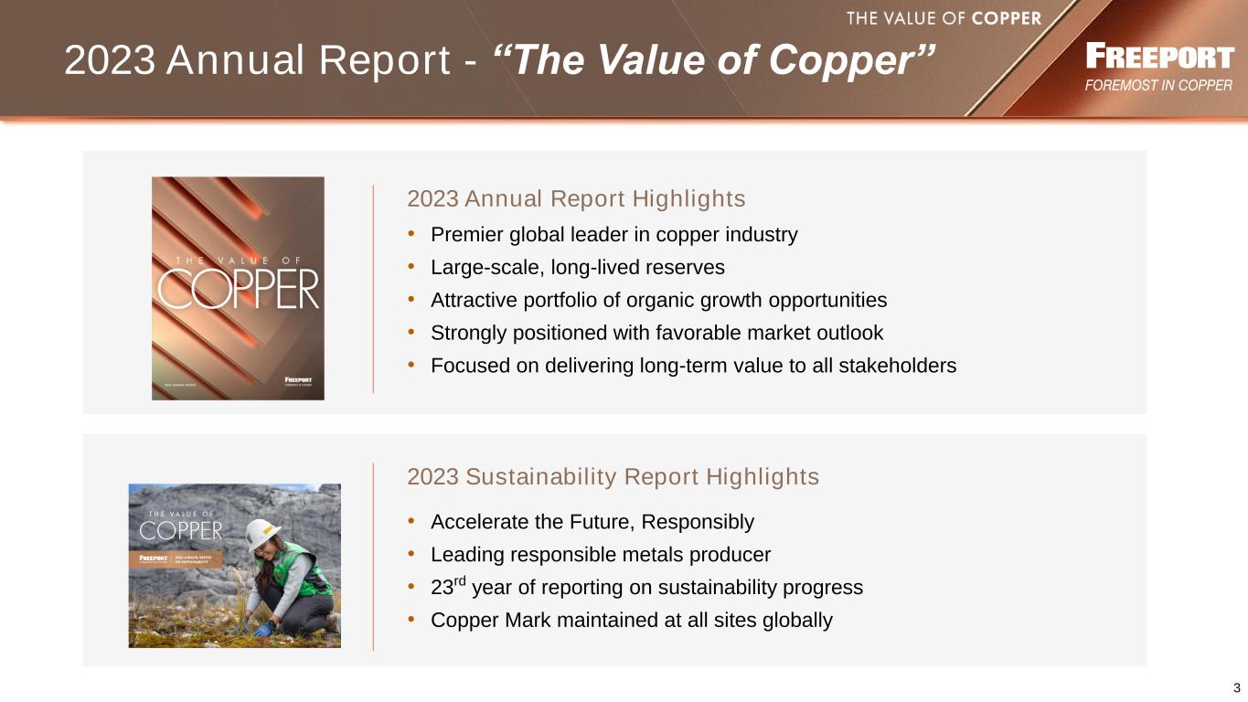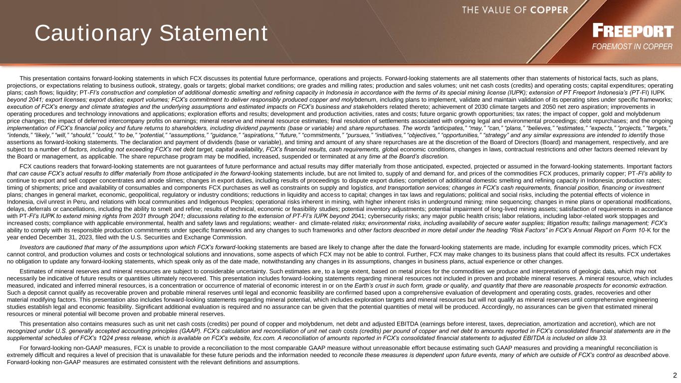 2 This presentation contains forward-looking statements in which FCX discusses its potential future performance, operations and projects. Forward-looking statements are all statements other than statements of historical facts, such as plans, projections, or expectations relating to business outlook, strategy, goals or targets; global market conditions; ore grades and milling rates; production and sales volumes; unit net cash costs (credits) and operating costs; capital expenditures; operating plans; cash flows; liquidity; PT-FI’s construction and completion of additional domestic smelting and refining capacity in Indonesia in accordance with the terms of its special mining license (IUPK); extension of PT Freeport Indonesia’s (PT-FI) IUPK beyond 2041; export licenses; export duties; export volumes; FCX’s commitment to deliver responsibly produced copper and molybdenum, including plans to implement, validate and maintain validation of its operating sites under specific frameworks; execution of FCX’s energy and climate strategies and the underlying assumptions and estimated impacts on FCX’s business and s takeholders related thereto; achievement of 2030 climate targets and 2050 net zero aspiration; improvements in operating procedures and technology innovations and applications; exploration efforts and results; development and production activities, rates and costs; future organic growth opportunities; tax rates; the impact of copper, gold and molybdenum price changes; the impact of deferred intercompany profits on earnings; mineral reserve and mineral resource estimates; final resolution of settlements associated with ongoing legal and environmental proceedings; debt repurchases; and the ongoing implementation of FCX’s financial policy and future returns to shareholders, including dividend payments (base or variable) and share repurchases. The words “anticipates,” “may,” “can,” “plans,” “believes,” “estimates,” “expects,” “projects,” “targets,” “intends,” “likely,” “will,” “should,” “could,” “to be,” “potential,” “assumptions,” “guidance,” “aspirations,” “future,” “commitments,” “pursues,” “initiatives,” “objectives,” “opportunities,” “strategy” and any similar expressions are intended to iden tify those assertions as forward-looking statements. The declaration and payment of dividends (base or variable), and timing and amount of any share repurchases are at the discretion of the Board of Directors (Board) and management, respectively, and are subject to a number of factors, including not exceeding FCX’s net debt target, capital availability, FCX’s financial results, cash requirements, global economic conditions, changes in laws, contractual restrictions and other factors deemed relevant by the Board or management, as applicable. The share repurchase program may be modified, increased, suspended or terminated at any time at the Board’s discretion. FCX cautions readers that forward-looking statements are not guarantees of future performance and actual results may differ materially from those anticipated, expected, projected or assumed in the forward-looking statements. Important factors that can cause FCX’s actual results to differ materially from those anticipated in the forward-looking statements include, but are not limited to, supply of and demand for, and prices of the commodities FCX produces, primarily copper; PT-FI’s ability to continue to export and sell copper concentrates and anode slimes; changes in export duties, including results of proceedings to dispute export duties; completion of additional domestic smelting and refining capacity in Indonesia; production rates; timing of shipments; price and availability of consumables and components FCX purchases as well as constraints on supply and logistics, and transportation services; changes in FCX’s cash requirements, financial position, financing or investment plans; changes in general market, economic, geopolitical, regulatory or industry conditions; reductions in liquidity and access to capital; changes in tax laws and regulations; political and social risks, including the potential effects of violence in Indonesia, civil unrest in Peru, and relations with local communities and Indigenous Peoples; operational risks inherent in mining, with higher inherent risks in underground mining; mine sequencing; changes in mine plans or operational modifications, delays, deferrals or cancellations, including the ability to smelt and refine; results of technical, economic or feasibility studies; potential inventory adjustments; potential impairment of long-lived mining assets; satisfaction of requirements in accordance with PT-FI’s IUPK to extend mining rights from 2031 through 2041; discussions relating to the extension of PT-FI’s IUPK beyond 2041; cybersecurity risks; any major public health crisis; labor relations, including labor-related work stoppages and increased costs; compliance with applicable environmental, health and safety laws and regulations; weather- and climate-related risks; environmental risks, including availability of secure water supplies; litigation results; tailings management; FCX’s ability to comply with its responsible production commitments under specific frameworks and any changes to such frameworks and other factors described in more detail under the heading “Risk Factors” in FCX’s Annual Report on Form 10-K for the year ended December 31, 2023, filed with the U.S. Securities and Exchange Commission. Investors are cautioned that many of the assumptions upon which FCX’s forward-looking statements are based are likely to change after the date the forward-looking statements are made, including for example commodity prices, which FCX cannot control, and production volumes and costs or technological solutions and innovations, some aspects of which FCX may not be able to control.