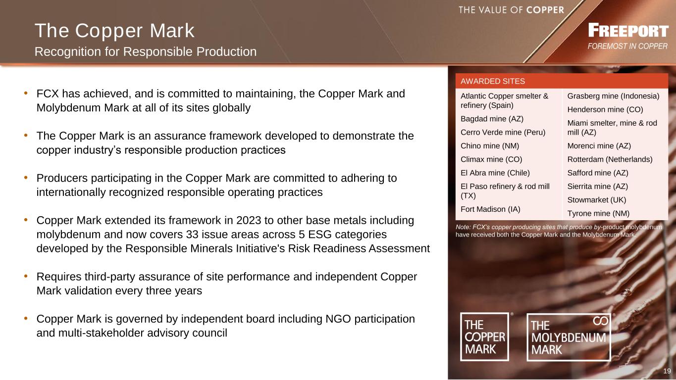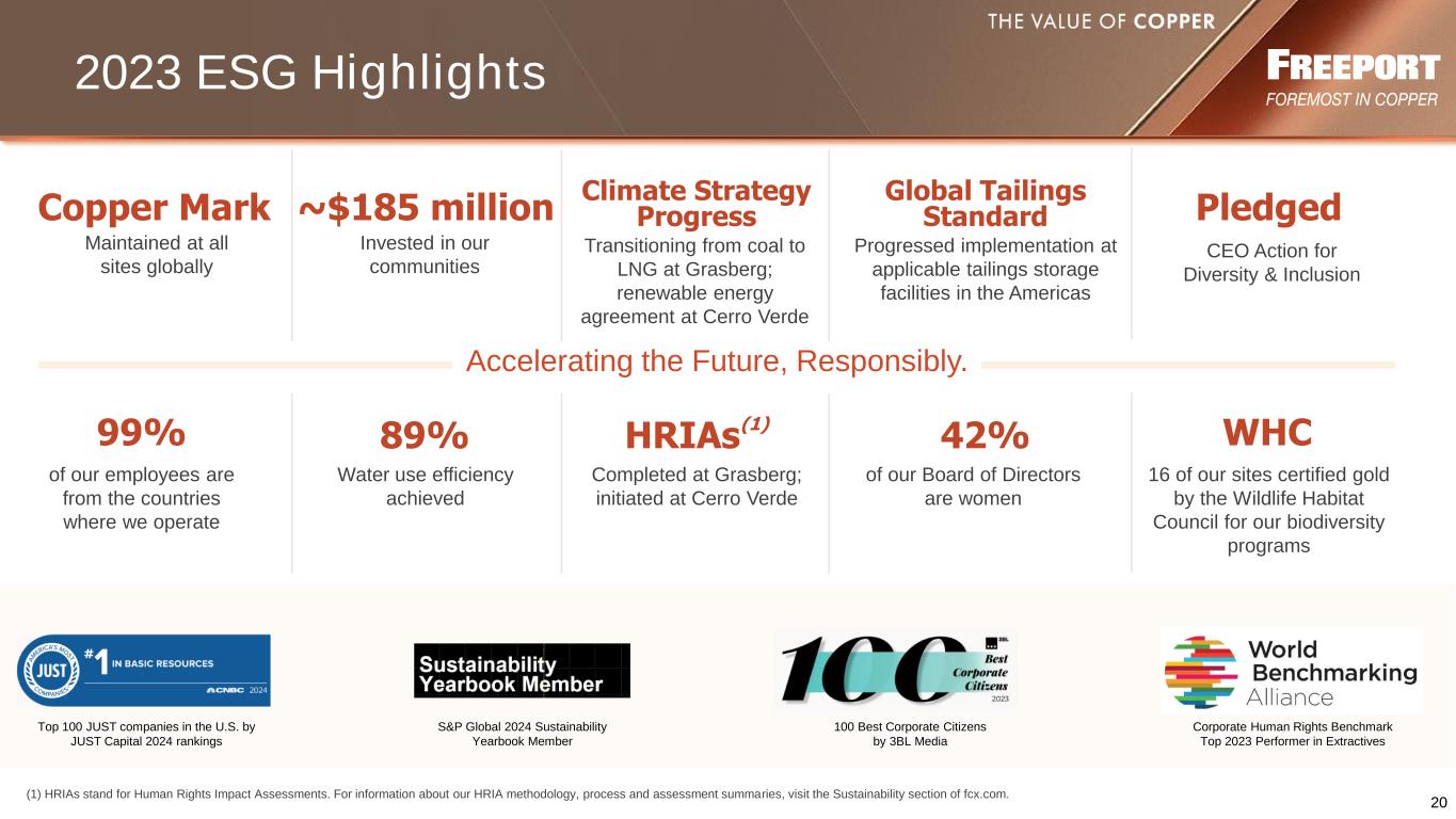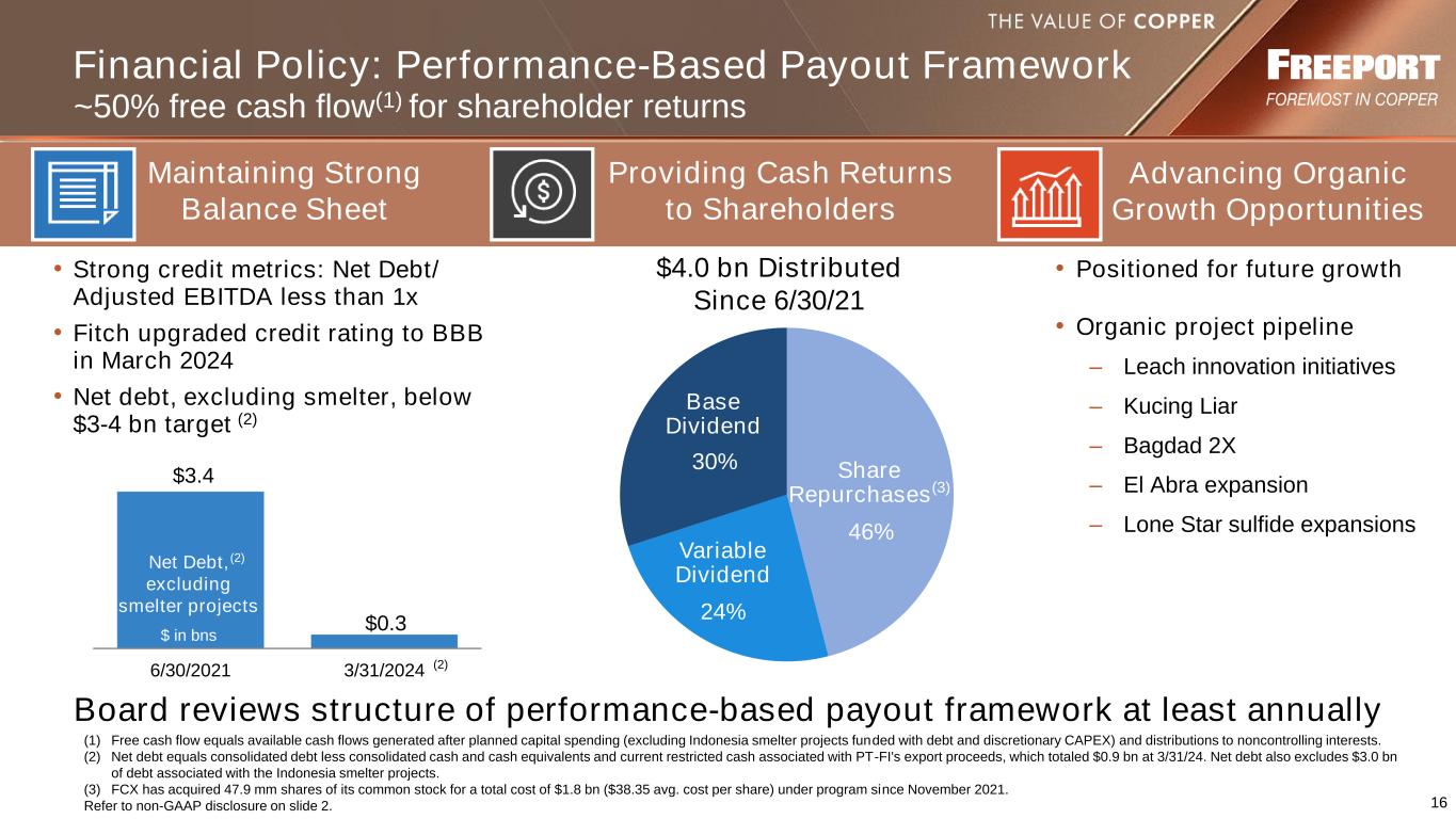 2 This presentation contains forward-looking statements in which FCX discusses its potential future performance, operations and projects. Forward-looking statements are all statements other than statements of historical facts, such as plans, projections, or expectations relating to business outlook, strategy, goals or targets; global market conditions; ore grades and milling rates; production and sales volumes; unit net cash costs (credits) and operating costs; capital expenditures; operating plans; cash flows; liquidity; PT-FI’s construction and completion of additional domestic smelting and refining capacity in Indonesia in accordance with the terms of its special mining license (IUPK); extension of PT Freeport Indonesia’s (PT-FI) IUPK beyond 2041; export licenses; export duties; export volumes; FCX’s commitment to deliver responsibly produced copper and molybdenum, including plans to implement, validate and maintain validation of its operating sites under specific frameworks; execution of FCX’s energy and climate strategies and the underlying assumptions and estimated impacts on FCX’s business and s takeholders related thereto; achievement of 2030 climate targets and 2050 net zero aspiration; improvements in operating procedures and technology innovations and applications; exploration efforts and results; development and production activities, rates and costs; future organic growth opportunities; tax rates; the impact of copper, gold and molybdenum price changes; the impact of deferred intercompany profits on earnings; mineral reserve and mineral resource estimates; final resolution of settlements associated with ongoing legal and environmental proceedings; debt repurchases; and the ongoing implementation of FCX’s financial policy and future returns to shareholders, including dividend payments (base or variable) and share repurchases. The words “anticipates,” “may,” “can,” “plans,” “believes,” “estimates,” “expects,” “projects,” “targets,” “intends,” “likely,” “will,” “should,” “could,” “to be,” “potential,” “assumptions,” “guidance,” “aspirations,” “future,” “commitments,” “pursues,” “initiatives,” “objectives,” “opportunities,” “strategy” and any similar expressions are intended to iden tify those assertions as forward-looking statements. The declaration and payment of dividends (base or variable), and timing and amount of any share repurchases are at the discretion of the Board of Directors (Board) and management, respectively, and are subject to a number of factors, including not exceeding FCX’s net debt target, capital availability, FCX’s financial results, cash requirements, global economic conditions, changes in laws, contractual restrictions and other factors deemed relevant by the Board or management, as applicable. The share repurchase program may be modified, increased, suspended or terminated at any time at the Board’s discretion. FCX cautions readers that forward-looking statements are not guarantees of future performance and actual results may differ materially from those anticipated, expected, projected or assumed in the forward-looking statements. Important factors that can cause FCX’s actual results to differ materially from those anticipated in the forward-looking statements include, but are not limited to, supply of and demand for, and prices of the commodities FCX produces, primarily copper; PT-FI’s ability to continue to export and sell copper concentrates and anode slimes; changes in export duties, including results of proceedings to dispute export duties; completion of additional domestic smelting and refining capacity in Indonesia; production rates; timing of shipments; price and availability of consumables and components FCX purchases as well as constraints on supply and logistics, and transportation services; changes in FCX’s cash requirements, financial position, financing or investment plans; changes in general market, economic, geopolitical, regulatory or industry conditions; reductions in liquidity and access to capital; changes in tax laws and regulations; political and social risks, including the potential effects of violence in Indonesia, civil unrest in Peru, and relations with local communities and Indigenous Peoples; operational risks inherent in mining, with higher inherent risks in underground mining; mine sequencing; changes in mine plans or operational modifications, delays, deferrals or cancellations, including the ability to smelt and refine; results of technical, economic or feasibility studies; potential inventory adjustments; potential impairment of long-lived mining assets; satisfaction of requirements in accordance with PT-FI’s IUPK to extend mining rights from 2031 through 2041; discussions relating to the extension of PT-FI’s IUPK beyond 2041; cybersecurity risks; any major public health crisis; labor relations, including labor-related work stoppages and increased costs; compliance with applicable environmental, health and safety laws and regulations; weather- and climate-related risks; environmental risks, including availability of secure water supplies; litigation results; tailings management; FCX’s ability to comply with its responsible production commitments under specific frameworks and any changes to such frameworks and other factors described in more detail under the heading “Risk Factors” in FCX’s Annual Report on Form 10-K for the year ended December 31, 2023, filed with the U.S. Securities and Exchange Commission. Investors are cautioned that many of the assumptions upon which FCX’s forward-looking statements are based are likely to change after the date the forward-looking statements are made, including for example commodity prices, which FCX cannot control, and production volumes and costs or technological solutions and innovations, some aspects of which FCX may not be able to control.