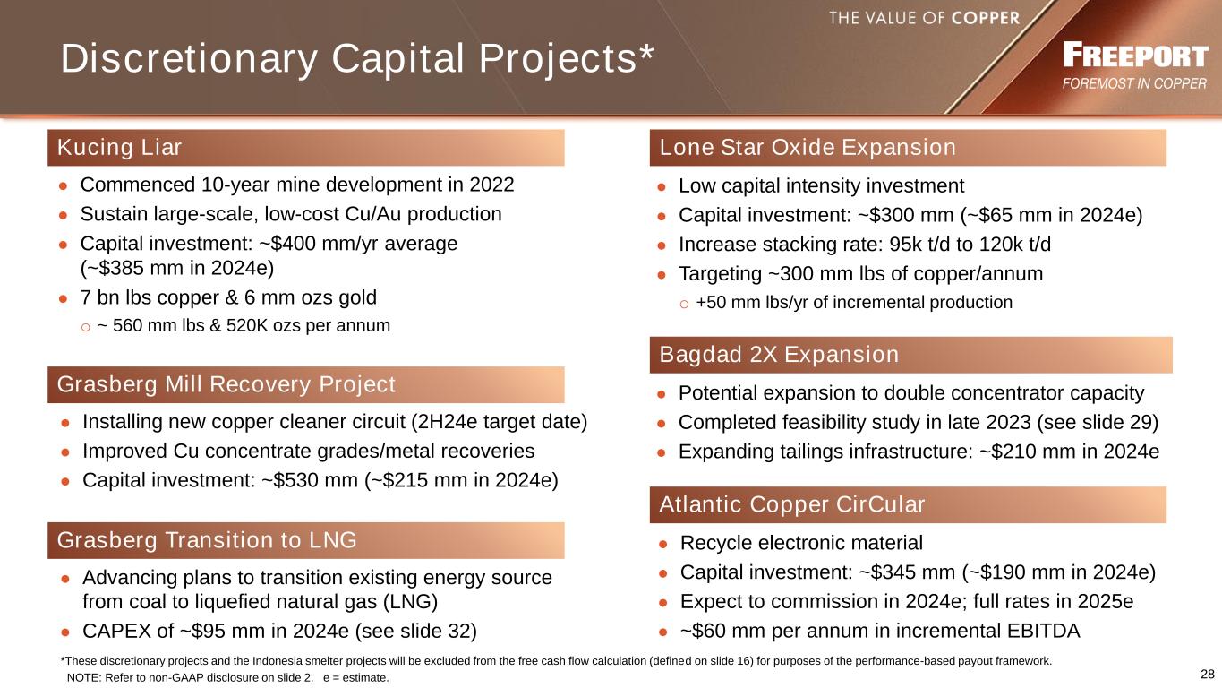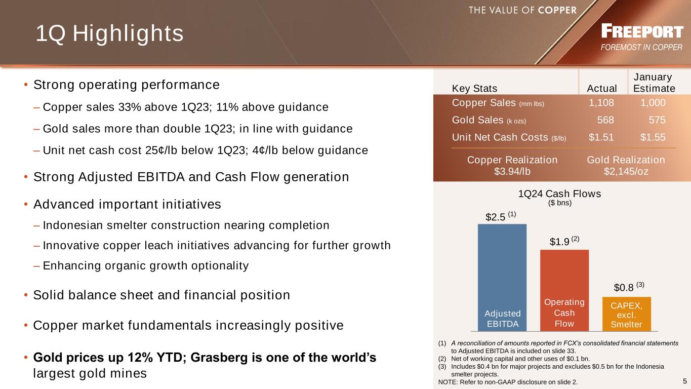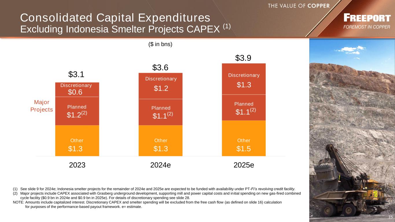 ▪Capital expenditures totaled $1.3 billion, including $0.4 billion for major mining projects and $0.5 billion for the Indonesia smelter projects, in first-quarter 2024. Capital expenditures are expected to approximate $4.6 billion, including $2.3 billion for major mining projects and $1.0 billion for the Indonesia smelter projects, for the year 2024.