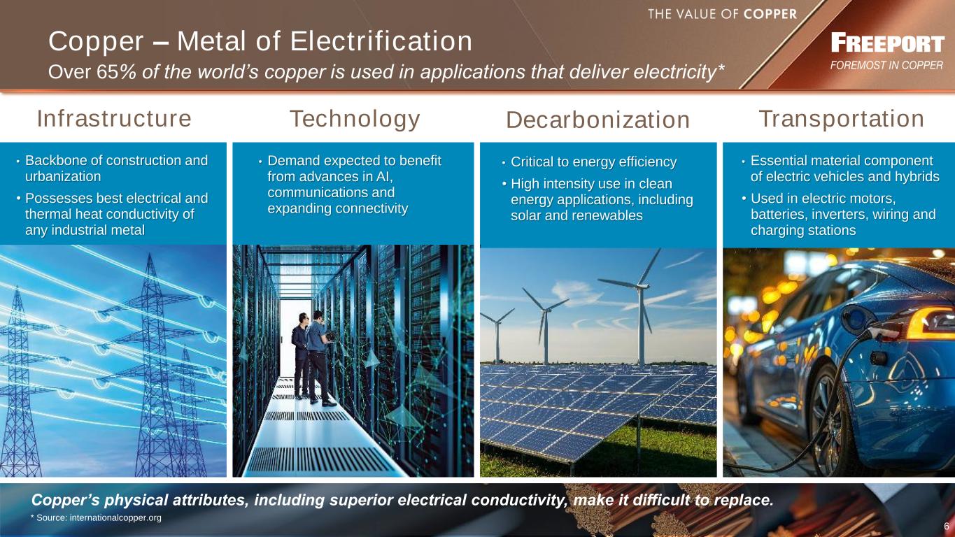 5 1Q Highlights • Strong operating performance – Copper sales 33% above 1Q23; 11% above guidance – Gold sales more than double 1Q23; in line with guidance – Unit net cash cost 25¢/lb below 1Q23; 4¢/lb below guidance • Strong Adjusted EBITDA and Cash Flow generation • Advanced important initiatives – Indonesian smelter construction nearing completion – Innovative copper leach initiatives advancing for further growth – Enhancing organic growth optionality • Solid balance sheet and financial position • Copper market fundamentals increasingly positive • Gold prices up 12% YTD; Grasberg is one of the world’s largest gold mines January Key Stats Actual Estimate Copper Sales (mm lbs) 1,108 1,000 Gold Sales (k ozs) 568 575 Unit Net Cash Costs ($/lb) $1.51 $1.55 Operating Cash Flow CAPEX, excl. Smelter $0.8 (3) $1.9 (2) 1Q24 Cash Flows ($ bns) Copper Realization Gold Realization $3.94/lb $2,145/oz (1) A reconciliation of amounts reported in FCX’s consolidated financial statements to Adjusted EBITDA is included on slide 33. (2) Net of working capital and other uses of $0.1 bn. (3) Includes $0.4 bn for major projects and excludes $0.5 bn for the Indonesia smelter projects. NOTE: Refer to non-GAAP disclosure on slide 2. $2.5 (1) Adjusted EBITDA