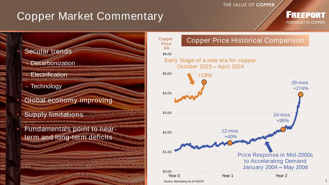 6 Copper – Metal of Electrification Over 65% of the world’s copper is used in applications that deliver electricity* Copper’s physical attributes, including superior electrical conductivity, make it difficult to replace. Infrastructure • Backbone of construction and urbanization • Possesses best electrical and thermal heat conductivity of any industrial metal Technology • Demand expected to benefit from advances in AI, communications and expanding connectivity Decarbonization • Critical to energy efficiency • High intensity use in clean energy applications, including solar and renewables Transportation • Essential material component of electric vehicles and hybrids • Used in electric motors, batteries, inverters, wiring and charging stations * Source: internationalcopper.org