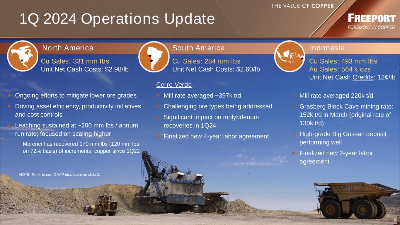 ▪Average unit net cash costs were $1.51 per pound of copper in first-quarter 2024. Unit net cash costs are expected to average $1.57 per pound of copper for the year 2024.