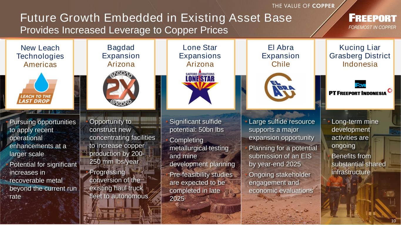 9 (1) Spending shared 51% MIND ID/49% FCX. For the remainder of 2024, Manyar smelter project is expected to be funded with availability under PT-FI’s revolving credit facility. Capital spending on the Manyar smelter is being debt financed and is not being deducted from cash available for returns to FCX shareholders. Estimates exclude capitalized interest and $0.3 bn in owner’s costs and commissioning during 2024e. e = estimate. Indonesia Downstream Processing Activities Manyar Smelter Construction Nearing Completion • PT-FI to become fully integrated metals producer • Upcoming Milestones in 2024 – June – Heat to furnaces – August – Initial concentrate run – October – Initial cathode production • Construction spending on Manyar & Precious Metal Refinery (1) – $0.5 billion remaining to be spent 2Q24e – 4Q24e – $0.3 billion in 2025e Anode Furnaces Flash Converting Furnace