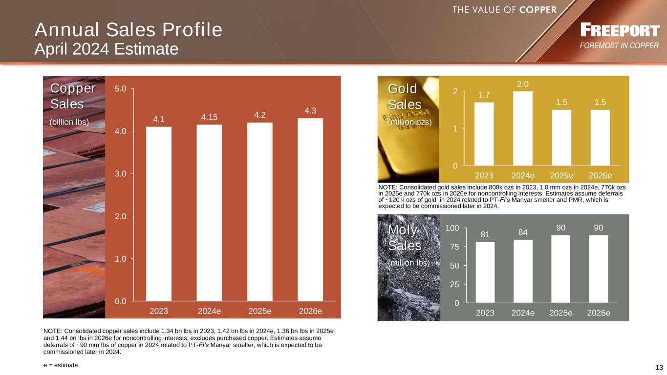 ▪Consolidated sales are expected to approximate 4.15 billion pounds of copper, 2.0 million ounces of gold and 84 million pounds of molybdenum for the year 2024, including 1.0 billion pounds of copper, 500 thousand ounces of gold and 21 million pounds of molybdenum in second-quarter 2024.