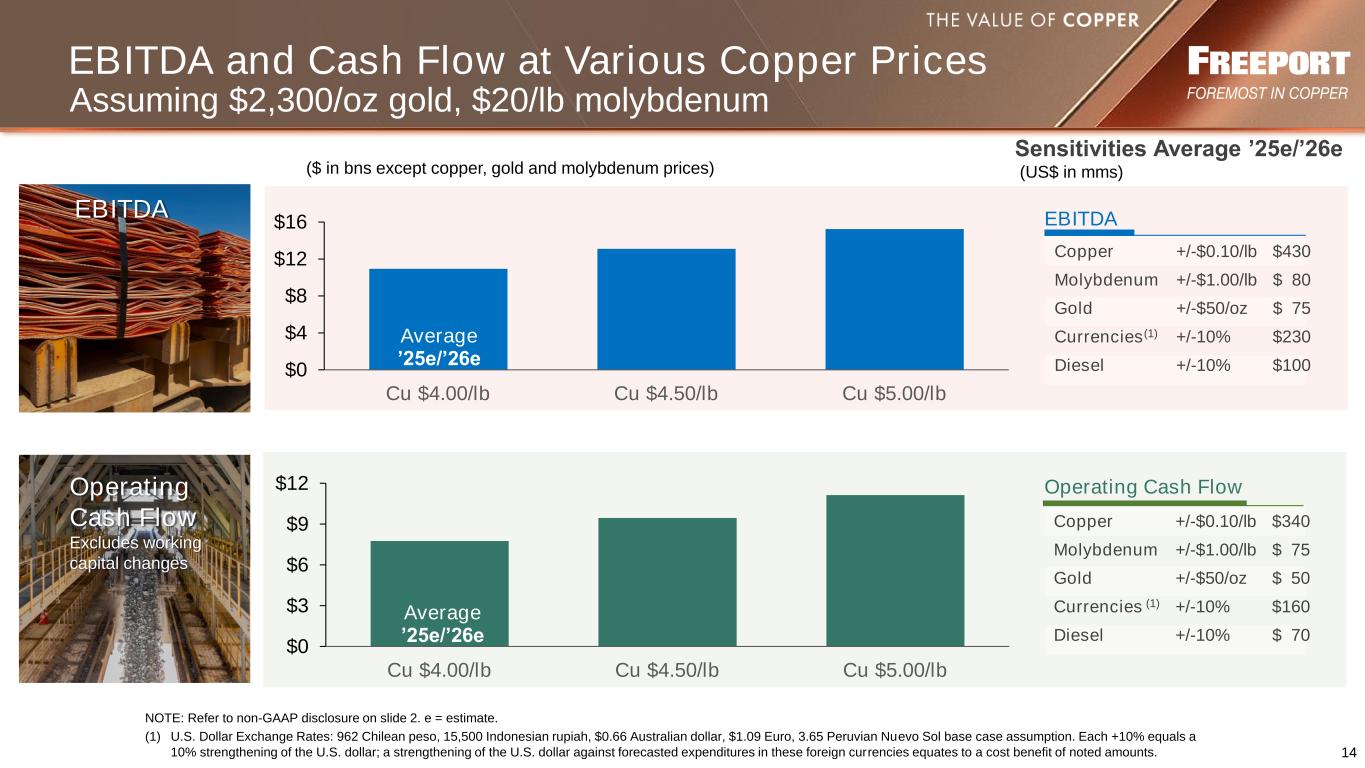 13 Annual Sales Profile NOTE: Consolidated copper sales include 1.34 bn lbs in 2023, 1.42 bn lbs in 2024e, 1.36 bn lbs in 2025e and 1.44 bn lbs in 2026e for noncontrolling interests; excludes purchased copper. Estimates assume deferrals of ~90 mm lbs of copper in 2024 related to PT-FI’s Manyar smelter, which is expected to be commissioned later in 2024. 0.0 1.0 2.0 3.0 4.0 5.0 2023 2024e 2025e 2026e 4.1 4.15 4.2 4.3 0 1 2 2023 2024e 2025e 2026e 1.7 1.5 1.5 0 25 50 75 100 2023 2024e 2025e 2026e 81 84 90 90 e = estimate. NOTE: Consolidated gold sales include 808k ozs in 2023, 1.0 mm ozs in 2024e, 770k ozs in 2025e and 770k ozs in 2026e for noncontrolling interests. Estimates assume deferrals of ~120 k ozs of gold in 2024 related to PT-FI’s Manyar smelter and PMR, which is expected to be commissioned later in 2024. (billion lbs) Copper Sales (million lbs) Moly Sales Gold Sales (million ozs) April 2024 Estimate 2.0