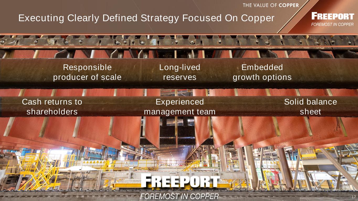 16 Financial Policy: Performance-Based Payout Framework (1) Free cash flow equals available cash flows generated after planned capital spending (excluding Indonesia smelter projects funded with debt and discretionary CAPEX) and distributions to noncontrolling interests. (2) Net debt equals consolidated debt less consolidated cash and cash equivalents and current restricted cash associated with PT-FI's export proceeds, which totaled $0.9 bn at 3/31/24. Net debt also excludes $3.0 bn of debt associated with the Indonesia smelter projects. (3) FCX has acquired 47.9 mm shares of its common stock for a total cost of $1.8 bn ($38.35 avg. cost per share) under program since November 2021. Refer to non-GAAP disclosure on slide 2. Board reviews structure of performance-based payout framework at least annually Maintaining Strong Balance Sheet 6/30/2021 3/31/2024 $0.3 $3.4 (2) Net Debt, excluding smelter projects $ in bns Providing Cash Returns to Shareholders $4.0 bn Distributed Since 6/30/21 46% Share Repurchases(3) Variable Dividend Base Dividend 30% 24% Advancing Organic Growth Opportunities • Positioned for future growth • Organic project pipeline – Leach innovation initiatives – Kucing Liar – Bagdad 2X – El Abra expansion – Lone Star sulfide expansions (2) (2) • Strong credit metrics: Net Debt/ Adjusted EBITDA less than 1x • Fitch upgraded credit rating to BBB in March 2024 • Net debt, excluding smelter, below $3-4 bn target ~50% free cash flow(1) for shareholder returns