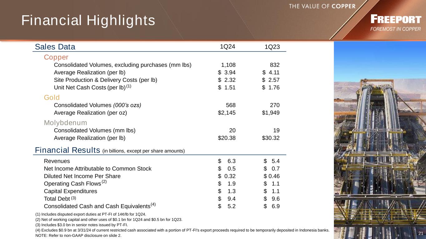 ▪Average realized prices were $3.94 per pound for copper, $2,145 per ounce for gold and $20.38 per pound for molybdenum in first-quarter 2024.
