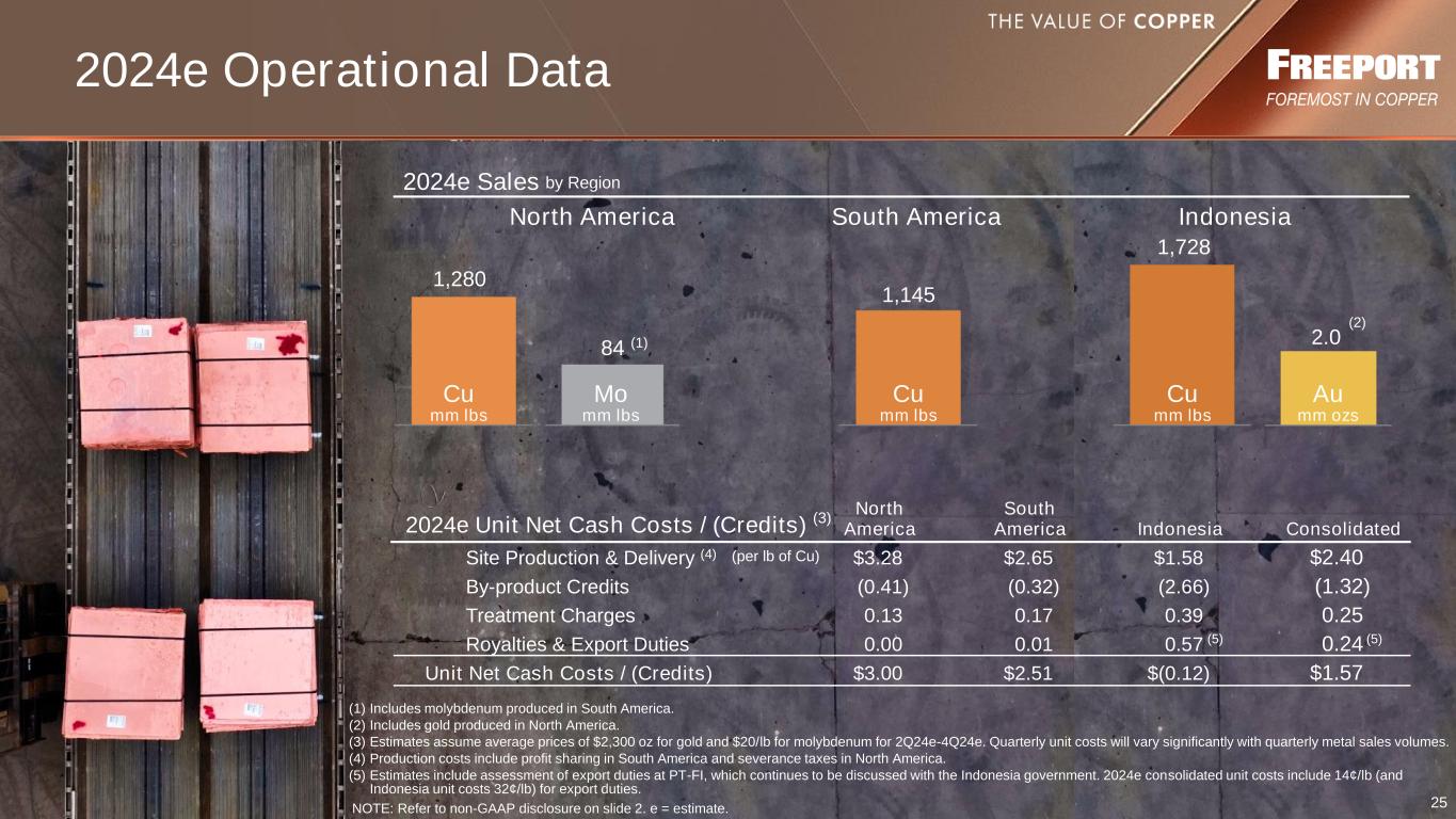 24 2024e Outlook Sales Outlook Unit Net Cash Cost of Copper Operating Cash Flows (1,3) Capital Expenditures (1) Assumes average prices of $2,300/oz gold and $20/lb molybdenum for 2Q24e-4Q24e. Estimates also include assessment of PT-FI’s export duties, which continues to be discussed with the Indonesia government. 2024e consolidated unit costs include 14¢/lb (and Indonesia unit costs 32¢/lb) for these export duties. (2) 2Q24e consolidated unit costs include 14¢/lb (and Indonesia unit costs 32¢/lb) for assessment of PT-FI’s export duties. (3) Each $100/oz change in gold is estimated to have an approximate $105 mm impact and each $2/lb change in molybdenum is estimated to have an approximate $90 mm impact. (4) Net of $0.2 billion of working capital and other uses. (5) Indonesia smelter projects for the remainder of 2024 are expected to be funded with availability under PT-FI’s revolving credit facility. (6) Major projects CAPEX includes $1.1 bn for planned projects and $1.2 bn of discretionary projects. e = estimate. Refer to non-GAAP disclosure on slide 2. • Copper: 4.15 billion lbs • Gold: 2.0 million ozs • Molybdenum: 84 million lbs • ~$7.4 billion(4) @ $4.25/lb copper for 2Q24e-4Q24e • Each 10¢/lb change in copper in 2Q24e-4Q24e = $270 mm impact • Site prod. & delivery o 2024e: $2.40/lb o 2Q24e: $2.52/lb • After by-product credits(1) o 2024e: $1.57/lb o 2Q24e: $1.57/lb (2) • $3.6 billion (excluding smelter projects(5)) o $2.3 billion for major projects(6) o $1.3 billion for other projects