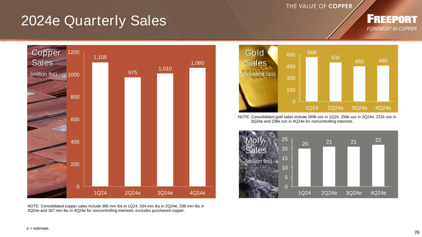 25 (1) (1) Includes molybdenum produced in South America. (2) Includes gold produced in North America. (3) Estimates assume average prices of $2,300 oz for gold and $20/lb for molybdenum for 2Q24e-4Q24e. Quarterly unit costs will vary significantly with quarterly metal sales volumes. (4) Production costs include profit sharing in South America and severance taxes in North America. (5) Estimates include assessment of export duties at PT-FI, which continues to be discussed with the Indonesia government. 2024e consolidated unit costs include 14¢/lb (and Indonesia unit costs 32¢/lb) for export duties. 1,145 84 1,280 1,728 2.0 (2) North America IndonesiaSouth America by Region2024e Sales Mo mm lbs Cu mm lbs Au mm ozs (per lb of Cu)Site Production & Delivery (4) $3.28 $2.65 $1.58 $2.40 By-product Credits (0.41) (0.32) (2.66) (1.32) Treatment Charges 0.13 0.17 0.39 0.25 Royalties & Export Duties 0.00 0.01 0.57 0.24 Unit Net Cash Costs / (Credits) $3.00 $2.51 $(0.12) $1.57 2024e Unit Net Cash Costs / (Credits) (3) North South America America Indonesia Consolidated Cu mm lbs Cu mm lbs NOTE: Refer to non-GAAP disclosure on slide 2. e = estimate. 2024e Operational Data (5) (5)