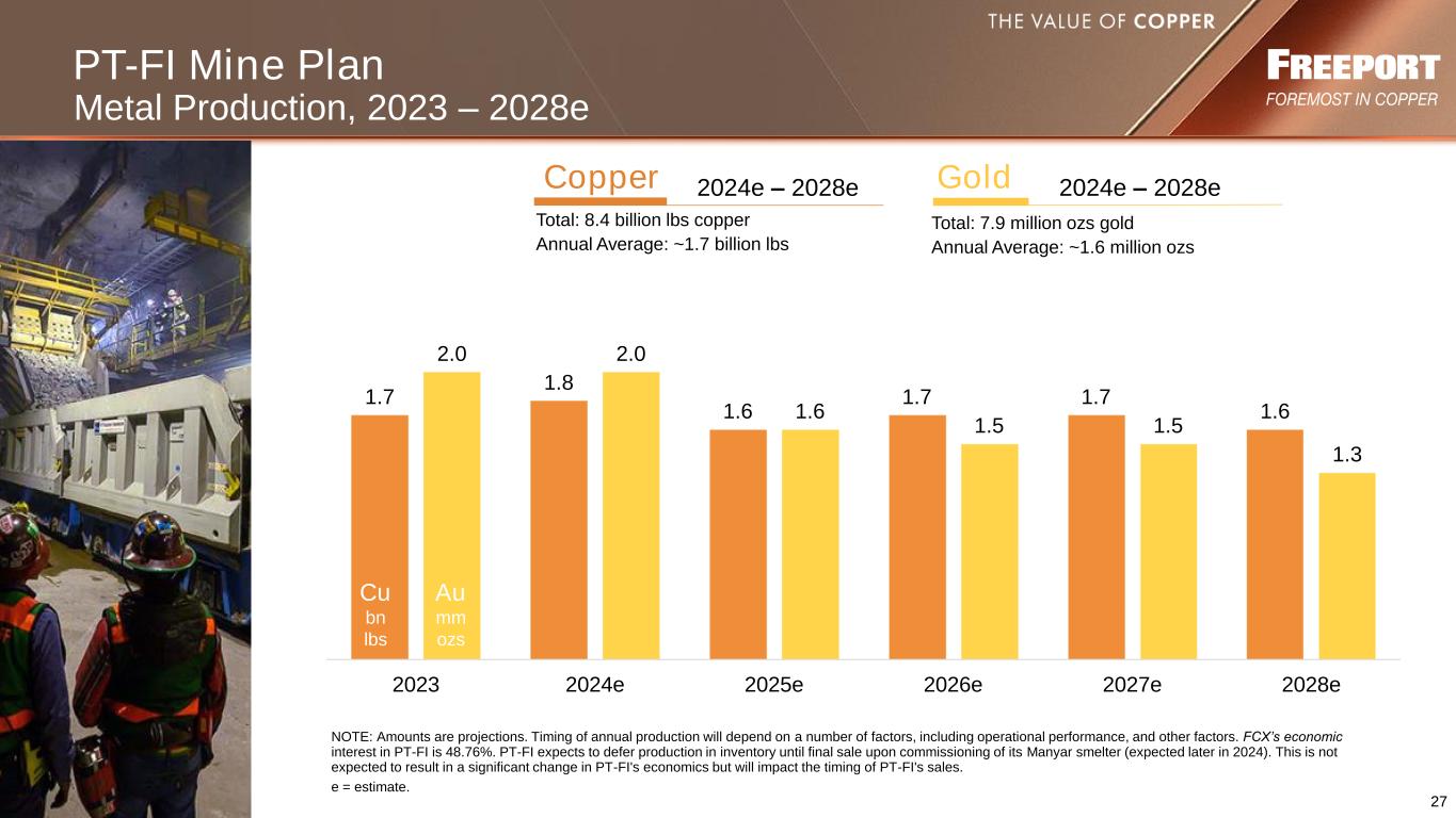 26 NOTE: Consolidated copper sales include 386 mm lbs in 1Q24, 334 mm lbs in 2Q24e, 336 mm lbs in 3Q24e and 367 mm lbs in 4Q24e for noncontrolling interests; excludes purchased copper. 0 200 400 600 800 1000 1200 1Q24 2Q24e 3Q24e 4Q24e 1,108 975 1,010 1,060 0 150 300 450 600 1Q24 2Q24e 3Q24e 4Q24e 500 450 460 0 5 10 15 20 25 1Q24 2Q24e 3Q24e 4Q24e 20 21 21 22 NOTE: Consolidated gold sales include 289k ozs in 1Q24, 256k ozs in 2Q24e, 231k ozs in 3Q24e and 236k ozs in 4Q24e for noncontrolling interests. (million lbs) Copper Sales (million lbs) Moly Sales Gold Sales (thousand ozs) 2024e Quarterly Sales e = estimate. 568