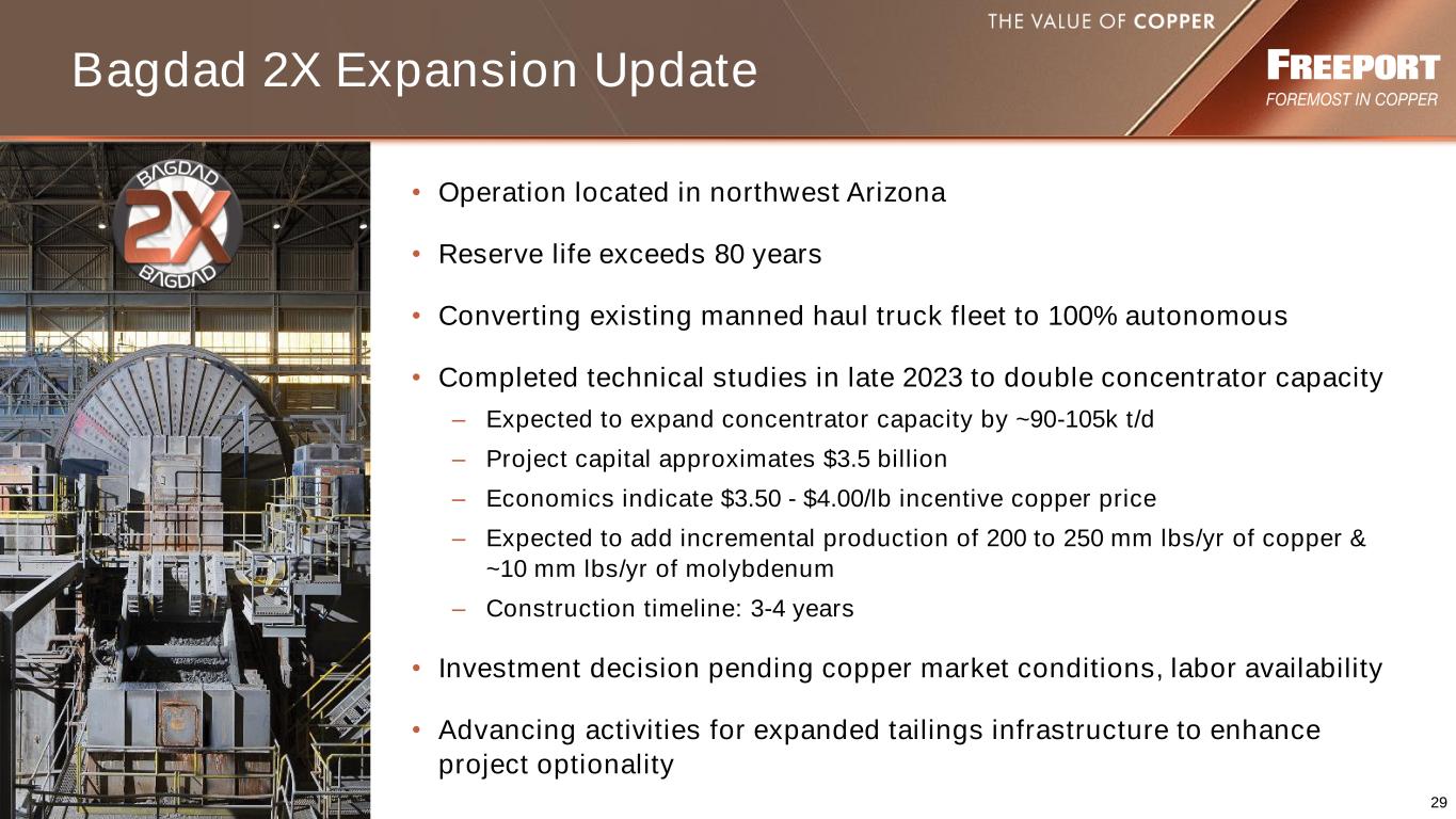 28 Discretionary Capital Projects* ● Commenced 10-year mine development in 2022 ● Sustain large-scale, low-cost Cu/Au production ● Capital investment: ~$400 mm/yr average (~$385 mm in 2024e) ● 7 bn lbs copper & 6 mm ozs gold o ~ 560 mm lbs & 520K ozs per annum Kucing Liar ● Recycle electronic material ● Capital investment: ~$345 mm (~$190 mm in 2024e) ● Expect to commission in 2024e; full rates in 2025e ● ~$60 mm per annum in incremental EBITDA Atlantic Copper CirCular Lone Star Oxide Expansion ● Low capital intensity investment ● Capital investment: ~$300 mm (~$65 mm in 2024e) ● Increase stacking rate: 95k t/d to 120k t/d ● Targeting ~300 mm lbs of copper/annum o +50 mm lbs/yr of incremental production Grasberg Mill Recovery Project ● Installing new copper cleaner circuit (2H24e target date) ● Improved Cu concentrate grades/metal recoveries ● Capital investment: ~$530 mm (~$215 mm in 2024e) *These discretionary projects and the Indonesia smelter projects will be excluded from the free cash flow calculation (defined on slide 16) for purposes of the performance-based payout framework. NOTE: Refer to non-GAAP disclosure on slide 2. e = estimate. ● Potential expansion to double concentrator capacity ● Completed feasibility study in late 2023 (see slide 29) ● Expanding tailings infrastructure: ~$210 mm in 2024e Bagdad 2X Expansion Grasberg Transition to LNG ● Advancing plans to transition existing energy source from coal to liquefied natural gas (LNG) ● CAPEX of ~$95 mm in 2024e (see slide 32)