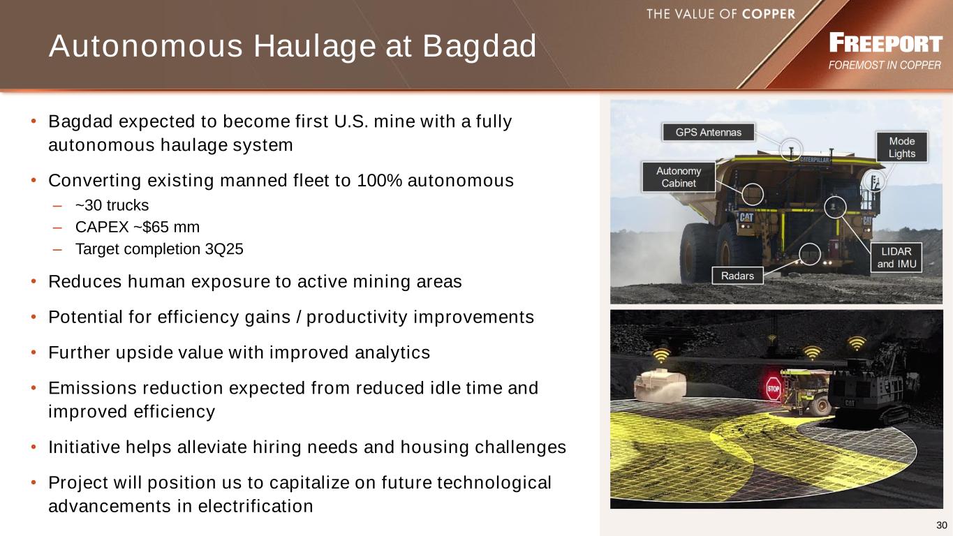 29 Bagdad 2X Expansion Update • Operation located in northwest Arizona • Reserve life exceeds 80 years • Converting existing manned haul truck fleet to 100% autonomous • Completed technical studies in late 2023 to double concentrator capacity – Expected to expand concentrator capacity by ~90-105k t/d – Project capital approximates $3.5 billion – Economics indicate $3.50 - $4.00/lb incentive copper price – Expected to add incremental production of 200 to 250 mm lbs/yr of copper & ~10 mm lbs/yr of molybdenum – Construction timeline: 3-4 years • Investment decision pending copper market conditions, labor availability • Advancing activities for expanded tailings infrastructure to enhance project optionality