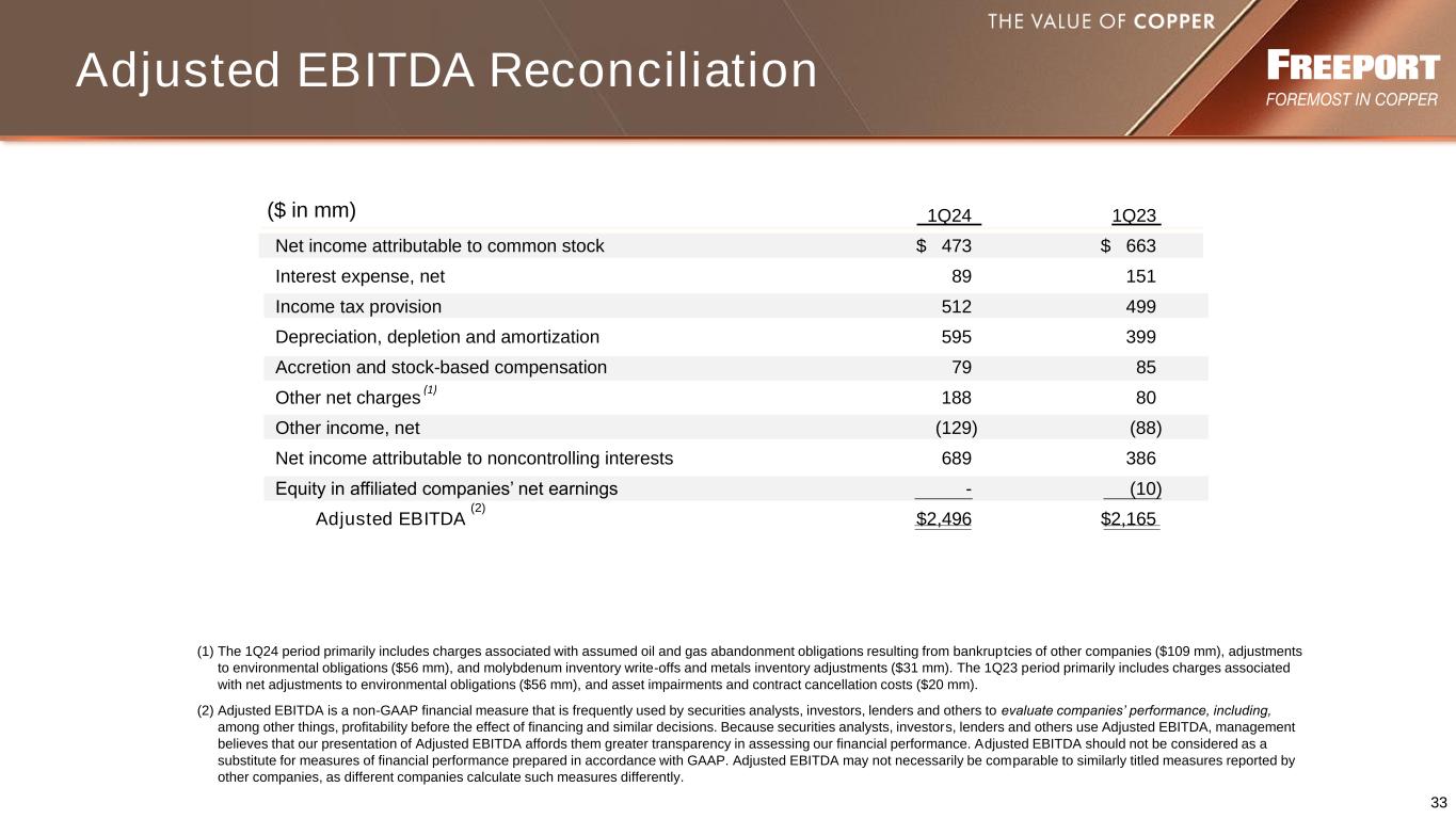 33 ($ in mm) Adjusted EBITDA Reconciliation 1Q24 1Q23 Net income attributable to common stock $ 473 $ 663 Interest expense, net 89 151 Income tax provision 512 499 Depreciation, depletion and amortization 595 399 Accretion and stock-based compensation 79 85 Other net charges (1) 188 80 Other income, net (129) (88) Net income attributable to noncontrolling interests 689 386 Equity in affiliated companies’ net earnings - (10) Adjusted EBITDA (2) $2,496 $2,165 (1) The 1Q24 period primarily includes charges associated with assumed oil and gas abandonment obligations resulting from bankruptcies of other companies ($109 mm), adjustments to environmental obligations ($56 mm), and molybdenum inventory write-offs and metals inventory adjustments ($31 mm). The 1Q23 period primarily includes charges associated with net adjustments to environmental obligations ($56 mm), and asset impairments and contract cancellation costs ($20 mm). (2) Adjusted EBITDA is a non-GAAP financial measure that is frequently used by securities analysts, investors, lenders and others to evaluate companies’ performance, including, among other things, profitability before the effect of financing and similar decisions. Because securities analysts, investors, lenders and others use Adjusted EBITDA, management believes that our presentation of Adjusted EBITDA affords them greater transparency in assessing our financial performance. Adjusted EBITDA should not be considered as a substitute for measures of financial performance prepared in accordance with GAAP. Adjusted EBITDA may not necessarily be comparable to similarly titled measures reported by other companies, as different companies calculate such measures differently.