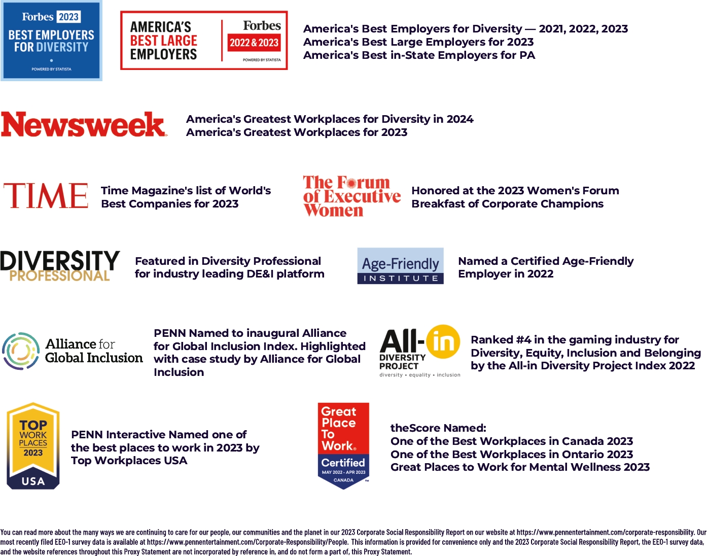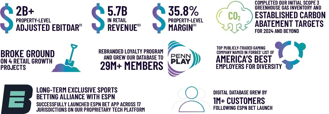 • Established inaugural carbon abatement targets to reduce Scope 1 and 2 GHG emissions by 25% by 2030. • Updated our Scope 1 and 2 greenhouse gas inventory and completed our initial Scope 3 greenhouse gas inventory. • Completed PENN’s inaugural CDP climate change disclosure. • Alignment with the Casino and Gaming Industry standard of the Sustainability Accounting Standards Board (“SASB”) reporting framework. • Alignment with the Task Force on Climate-Related Financial Disclosures (“TCFD”) reporting framework. • Procured 100% carbon-free energy for properties located in deregulated jurisdictions. • Diverted from landfills over 4,300 tons of paper, bailed cardboard, scrap metal, glass, plastic and aluminum waste and recycled over 2,000 pallets. Our racetracks diverted over 42,000 tons of agricultural waste to local farms. • LEED certification targeted for two of our current development projects. • PENN’s properties increased their procurement of cage-free eggs and reduced-antibiotic turkey. | | | • New Diverse Vendor Incubator Program implemented to help our current vendors enhance their capacity and grow their businesses. • Exceeded our goals for diverse vendor procurement, with a total spend of over $108M – a 70% increase in companywide diverse spend since implementation of our program in 2020. • Launched our new PENN Women initiative which is intended to increase inclusivity and provide allies and mentorship at all levels of our workforce. • Expanded our talent development offerings in 2023 with the following pilot programs: HR Business Partner Cohort, Mentor Program, Early Career Leadership Academy and Mid-Career Leadership Academy, while relaunching our Gaming and Hospitality Cohorts. | | | • Our team members provided over 9,500 volunteer hours to help those in need. • Created military scholarships at Penn State Berks and Alvernia University to help student veterans and active-duty military students in need of financial support to pursue their educational goals. • Expect to create approximately 1,500 permanent jobs and 1,750 construction jobs as a result of our 4 retail growth projects, which all broke ground in 2023. • Companywide we donated over $8M in support to local charities and veteran focused organizations and generated over $17 million in economic development grants. |