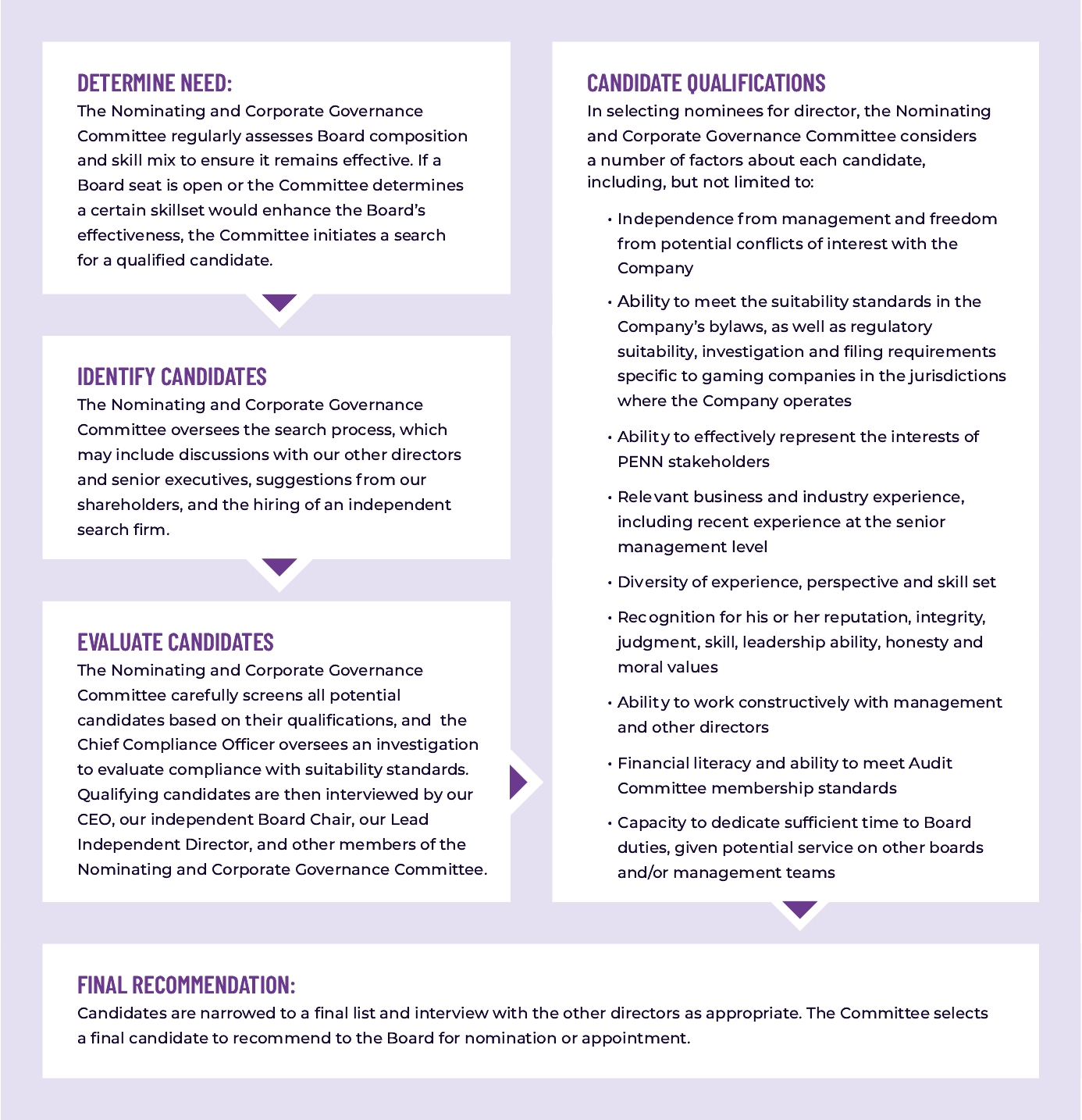 (1) | PENN Entertainment’s Board and Committee leaders are: (i) Jane Scaccetti (Audit Committee Chair); (ii) Barbara Shattuck Kohn (Compensation Committee Chair); (iii) Marla Kaplowitz (Nominating and Corporate Governance Committee Chair); (iv) Thomas Auriemma (Compliance Committee Chair); (v) Barbara Shattuck Kohn (Lead Independent Director); and (vi) David Handler (Board Chair). Each of these Board and Committee leaders are independent directors except for Mr. Auriemma who serves as an independent non-director member of the Compliance Committee. Mr. Auriemma is the Company’s former Vice President, Chief Compliance Officer and former Director of the Division of Gaming Enforcement in New Jersey, with over 30 years of experience as a gaming regulator in the State of New Jersey. |