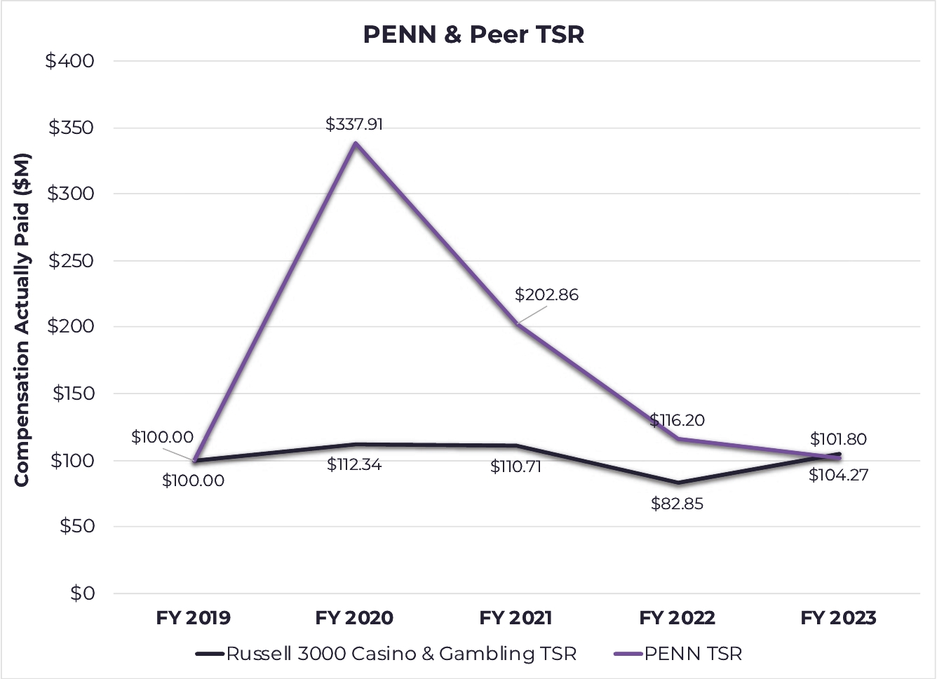 ALIGNMENT WITH SHAREHOLDER INTERESTS | | | • Annual say-on-pay vote • One class of common stock with equal voting rights • Shareholder engagement program is overseen by the Nominating and Corporate Governance Committee, with engagement efforts led by our Board Chair and the Chairs of our Compensation Committee and Nominating and Corporate Governance Committee • Robust stock ownership guidelines for executives and directors • Policies prohibiting hedging and pledging of PENN securities |