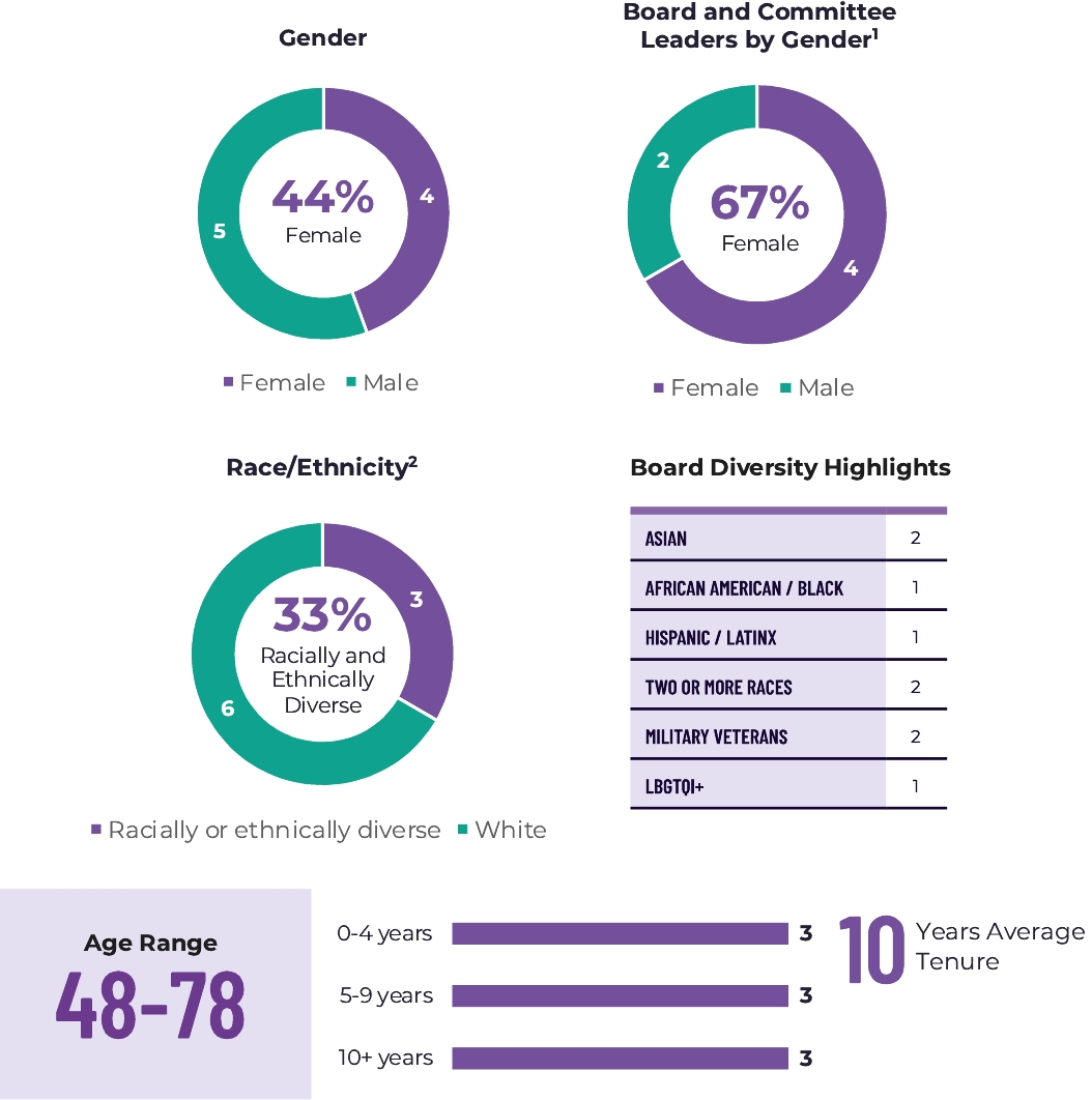 REFRESHED AND DIVERSE BOARD | | | • Ongoing and thoughtful Board and Committee refreshment • Three new independent directors appointed in the last four years with extensive marketing, strategy, technology, media, cybersecurity and digital transformation experience to effectively oversee growth strategy • 67%(1) diverse Board based on gender, race/ethnicity and LGBTQ+ identity • 4 out of 6 board leadership roles are held by women |