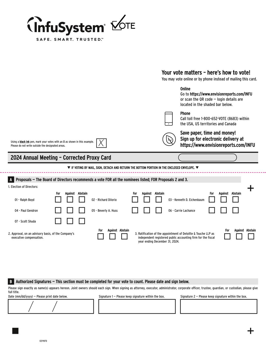 Proposals — The Board of Directors recommend a vote FOR all the nominees listed, FOR Proposals X – X and for every X YEARS on Proposal X. 02 - Richard DiIorio 05 - Beverly A. Huss For Against Abstain 03 - Kenneth D. Eichenbaum 06 - Carrie Lachance For Against Abstain 01 - Ralph Boyd 04 - Paul Gendron 07 - Scott Shuda For Against Abstain Using a black ink pen, mark your votes with an X as shown in this example. Please do not write outside the designated areas. 03YKFD + + 2. Approval, on an advisory basis, of the Company’s executive compensation. 1. Election of Directors: For Against Abstain Please sign exactly as name(s) appears hereon. Joint owners should each sign. When signing as attorney, executor, administrator, corporate officer, trustee, guardian, or custodian, please give full title. Signature 1 — Please keep signature within the box. Signature 2 — Please keep signature within the box.Date (mm/dd/yyyy) — Please print date below. Authorized Signatures — This section must be completed for your vote to count. Please date and sign below.B q IF VOTING BY MAIL, SIGN, DETACH AND RETURN THE BOTTOM PORTION IN THE ENCLOSED ENVELOPE. q 2024 Annual Meeting – Corrected Proxy Card i t r r c ends a vote FOR all the nominees listed; FOR Pr posals 2 and 3.A 3. Ratification of the appointment of Deloitte & Touche LLP as independent registered public accounting firm for the fiscal year ending December 31, 2024. For Against Abstain If no electronic voting, delete QR code and control # Δ ≈ You may vote online or by phone instead of mailing this card. Online Go to https://www.envisionreports.com/INFU or scan the QR code — login details are located in the shaded bar below. Save paper, time and money! Sign up for electronic delivery at https://www.envisionreports.com/INFU Phone Call toll free 1-800-652-VOTE (8683) within the USA, US territories and Canada Your vote matters – here’s how to vote!
