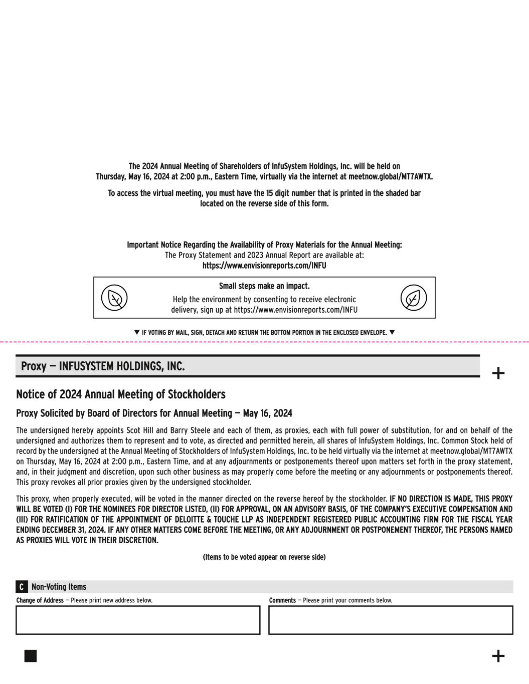 Small steps make an impact. Help the environment by consenting to receive electronic delivery, sign up at https://www.envisionreports.com/INFU Notice of 2024 Annual Meeting of Stockholders Proxy Solicited by Board of Directors for Annual Meeting — May 16, 2024 The undersigned hereby appoints Scot Hill and Barry Steele and each of them, as proxies, each with full power of substitution, for and on behalf of the undersigned and authorizes them to represent and to vote, as directed and permitted herein, all shares of InfuSystem Holdings, Inc. Common Stock held of record by the undersigned at the Annual Meeting of Stockholders of InfuSystem Holdings, Inc. to be held virtually via the internet at meetnow.global/MT7AWTX on Thursday, May 16, 2024 at 2:00 p.m., Eastern Time, and at any adjournments or postponements thereof upon matters set forth in the proxy statement, and, in their judgment and discretion, upon such other business as may properly come before the meeting or any adjournments or postponements thereof. This proxy revokes all prior proxies given by the undersigned stockholder. This proxy, when properly executed, will be voted in the manner directed on the reverse hereof by the stockholder. IF NO DIRECTION IS MADE, THIS PROXY WILL BE VOTED (I) FOR THE NOMINEES FOR DIRECTOR LISTED, (II) FOR APPROVAL, ON AN ADVISORY BASIS, OF THE COMPANY’S EXECUTIVE COMPENSATION AND (III) FOR RATIFICATION OF THE APPOINTMENT OF DELOITTE & TOUCHE LLP AS INDEPENDENT REGISTERED PUBLIC ACCOUNTING FIRM FOR THE FISCAL YEAR ENDING DECEMBER 31, 2024. IF ANY OTHER MATTERS COME BEFORE THE MEETING, OR ANY ADJOURNMENT OR POSTPONEMENT THEREOF, THE PERSONS NAMED AS PROXIES WILL VOTE IN THEIR DISCRETION. (Items to be voted appear on reverse side) Proxy — INFUSYSTEM HOLDINGS, INC. q IF VOTING BY MAIL, SIGN, DETACH AND RETURN THE BOTTOM PORTION IN THE ENCLOSED ENVELOPE. q Change of Address — Please print new address below. Comments — Please print your comments below. Non-Voting ItemsC + + Important Notice Regarding the Availability of Proxy Materials for the Annual Meeting: The Proxy Statement and 2023 Annual Report are available at: https://www.envisionreports.com/INFU The 2024 Annual Meeting of Shareholders of InfuSystem Holdings, Inc. will be held on Thursday, May 16, 2024 at 2:00 p.m., Eastern Time, virtually via the internet at meetnow.global/MT7AWTX. To access the virtual meeting, you must have the 15 digit number that is printed in the shaded bar located on the reverse side of this form.