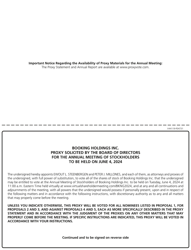 You are cordially invited to attend the 2024 Annual Meeting of Stockholders (the “Annual Meeting”) of Booking Holdings Inc. to be held at 11:00 a.m. Eastern Time on Tuesday, June 4, 2024.
