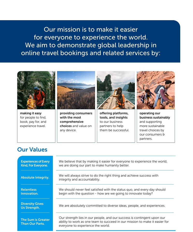 Our company’s mission is: To Make It Easier For Everyone to Experience The World. From our very beginning, we believed that we could use technology to dramatically improve the way people discovered, searched, booked and experienced travel. Now, more than 25 years later, we are one of the world’s largest travel companies and achieved a major milestone in 2023: we booked more than one billion room nights through our platforms.