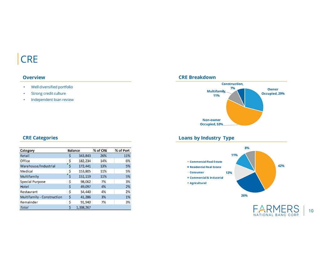 Founded in 1887, Farmers National Banc Corp. is a diversified financial services company headquartered in Canfield, Ohio, with $5.1 billion in banking assets. Farmers National Banc Corp.s wholly-owned subsidiaries are comprised of The Farmers National Bank of Canfield, a full-service national bank engaged in commercial and retail banking with 62 banking locations in Mahoning, Trumbull,