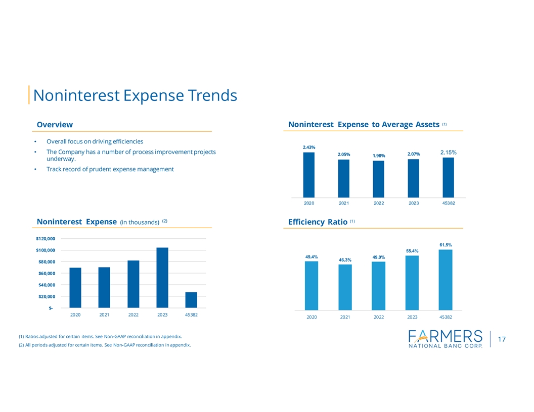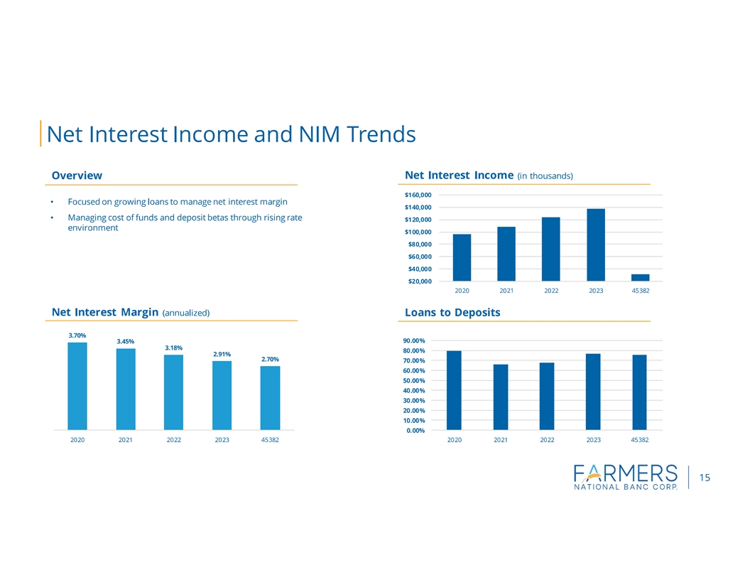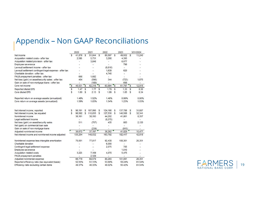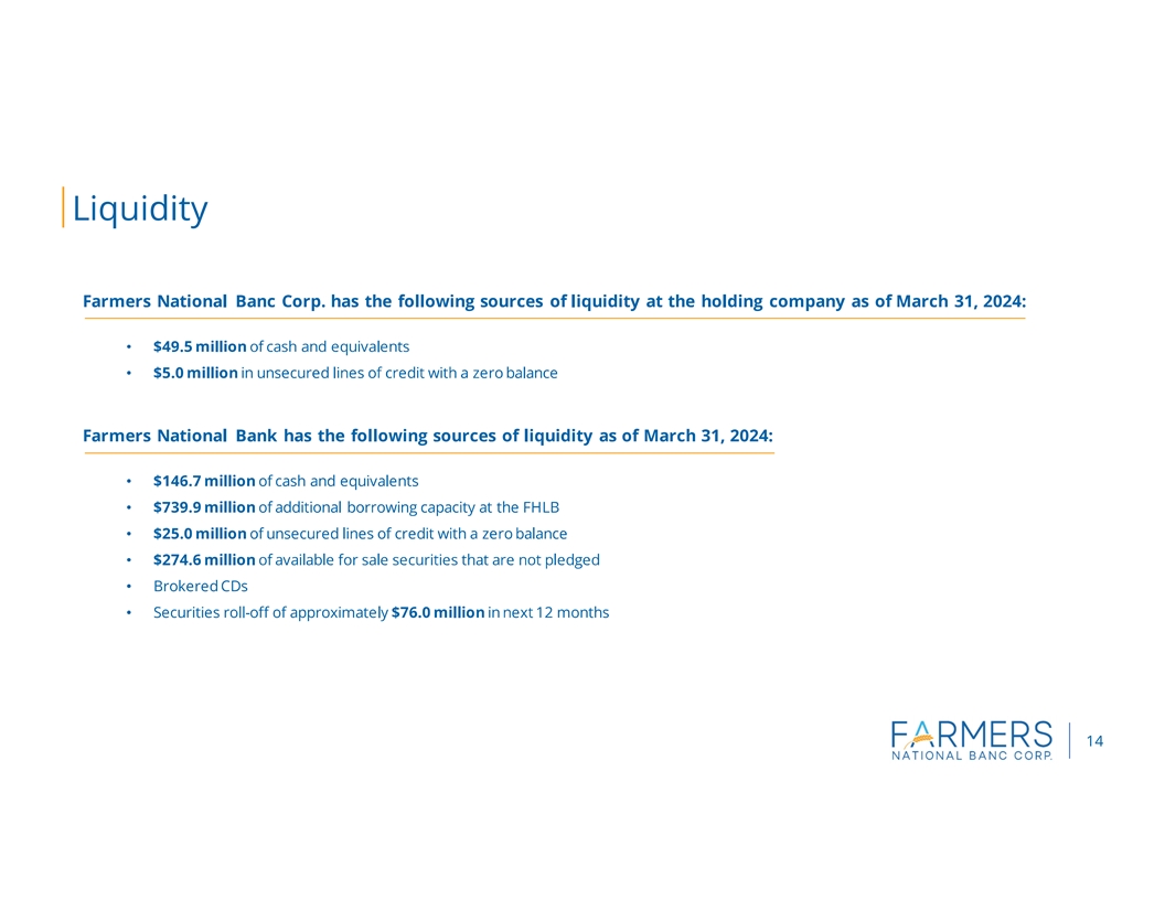 CANFIELD, Ohio (April 24, 2024) Farmers National Banc Corp. (Farmers or the Company) (NASDAQ: FMNB) reported net income of $11.2 million, or $0.30 per diluted share, for the three months ended March 31, 2024, compared to $7.1 million, or $0.19 per diluted share, for the three months ended March 31, 2023. Net income for the first quarter of 2024 included a pretax item of $2.1 million for the loss on the sale of investment securities. Excluding this item (non-GAAP), net income for the first quarter of 2024 was $12.9 million, or $0.34 per diluted share.