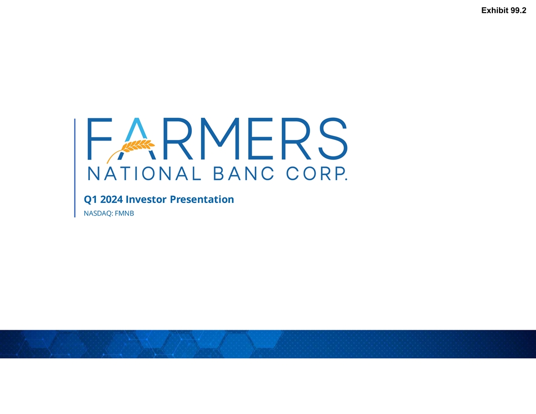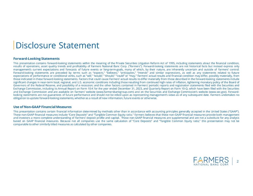 We make statements in this news release and our related investor conference call, and we may from time to time make other statements, that are forward-looking statements within the meaning of the Private Securities Litigation Reform Act of 1995, including statements about Farmers financial condition, results of operations, asset quality trends and profitability. Forward-looking statements are not historical facts but instead represent only managements current expectations and forecasts regarding future events, many of which, by their nature, are inherently uncertain and outside of Farmers control. Forward-looking statements are preceded by terms such as expects, believes, anticipates, intends and similar expressions, as well as any statements related to future expectations of performance or conditional verbs, such as will, would, should, could or may. Farmers actual results and financial condition may differ, possibly materially, from the anticipated results and financial condition indicated in these forward-looking statements. Factors that could cause Farmers actual results to differ materially from those described in certain forward-looking statements include significant changes in near-term local, regional, and U.S. economic conditions including those resulting from continued high rates of inflation, tightening monetary policy of the Board of Governors of the Federal Reserve, and possibility of a recession; and the other factors contained in Farmers Annual Report on Form 10-K for the year ended December 31, 2023 and subsequent Quarterly Reports on Form 10-Q filed with the Securities and Exchange Commission (SEC) and available on Farmers website (www.farmersbankgroup.com) and on the SECs website (www.sec.gov). Forward-looking statements are not guarantees of future performance and should not be relied upon as representing managements views as of any subsequent date. Farmers does not undertake any obligation to update the forward-looking statements to reflect the impact of circumstances or events that may arise after the date of the forward-looking statements.