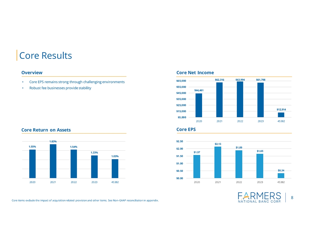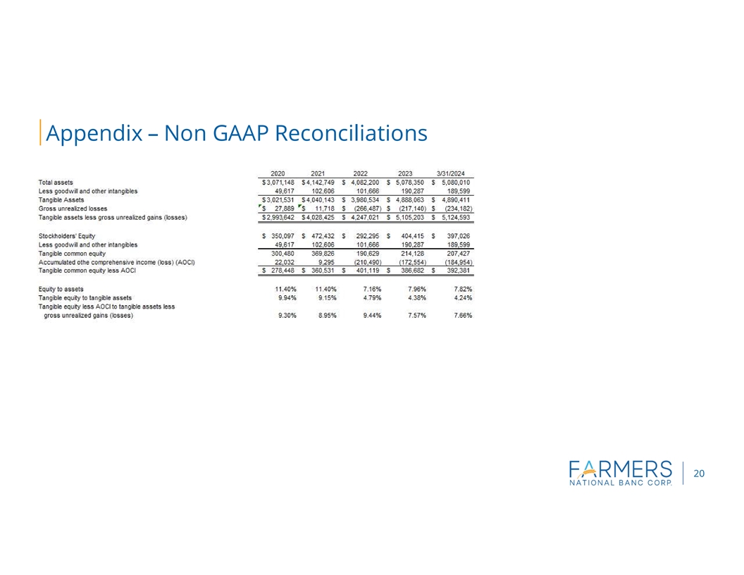 This press release includes disclosures of Farmers tangible common equity ratio, return on average tangible assets, return on average tangible equity, net income excluding costs related to acquisition activities and certain items, return on average assets excluding merger costs and certain items, return on average equity excluding merger costs and certain items, net interest margin excluding acquisition marks and related accretion and PPP interest and fees and efficiency ratio less certain items, which are financial measures not prepared in accordance with generally accepted accounting principles in the United States (GAAP). A non-GAAP financial measure is a numerical measure of historical or future financial performance, financial position or cash flows that excludes or includes amounts that are required to be disclosed by GAAP. Farmers believes that these non-GAAP financial measures provide both management and investors a more complete understanding of the underlying operational results and trends and Farmers marketplace performance. The presentation of this additional information is not meant to be considered in isolation or as a substitute for the numbers prepared in accordance with GAAP. The reconciliations of non-GAAP financial measures to their GAAP equivalents are included in the tables following Consolidated Financial Highlights below.