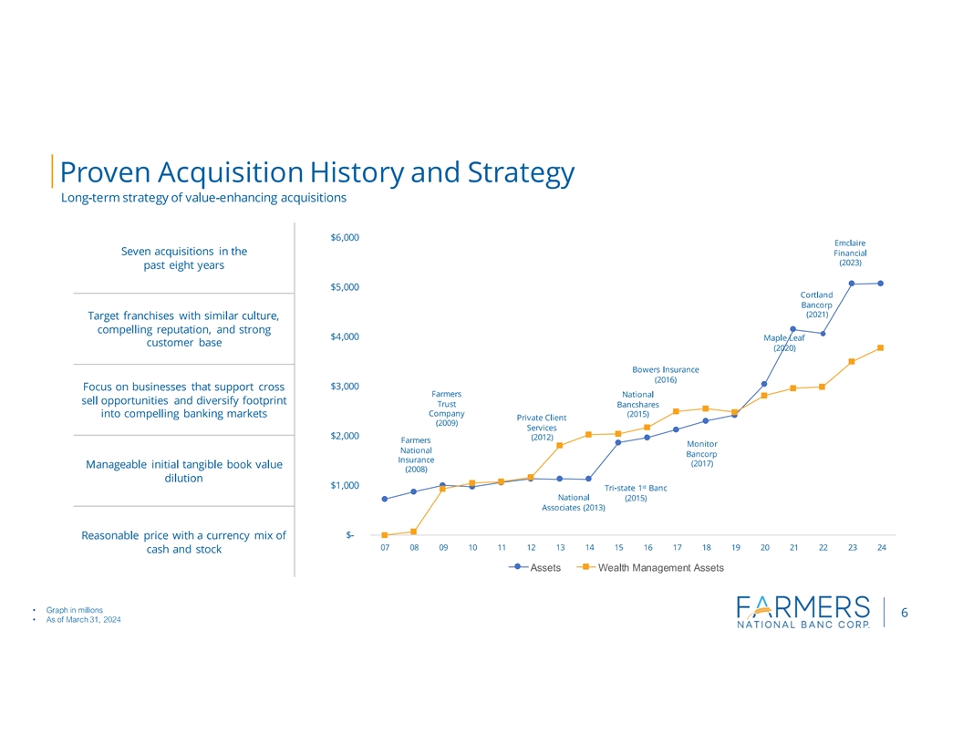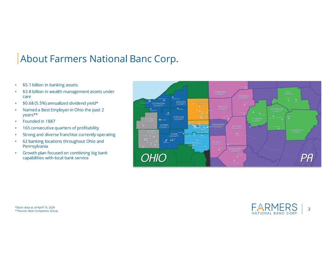 Columbiana, Portage, Stark, Wayne, Medina, Geauga and Cuyahoga Counties in Ohio and Beaver, Butler, Allegheny, Jefferson, Clarion, Venango, Clearfield, Mercer, Elk and Crawford Counties in Pennsylvania, and Farmers Trust Company, which operates five trust offices and offers services in the same geographic markets. Total wealth management assets under care at March 31, 2024 are $3.8 billion. Farmers National Insurance, LLC, a wholly-owned subsidiary of The Farmers National Bank of Canfield, offers a variety of insurance products.