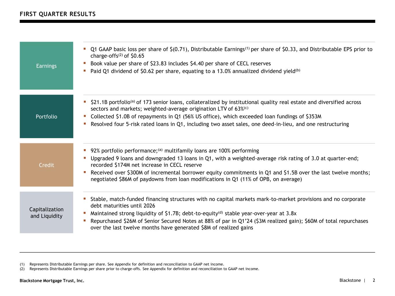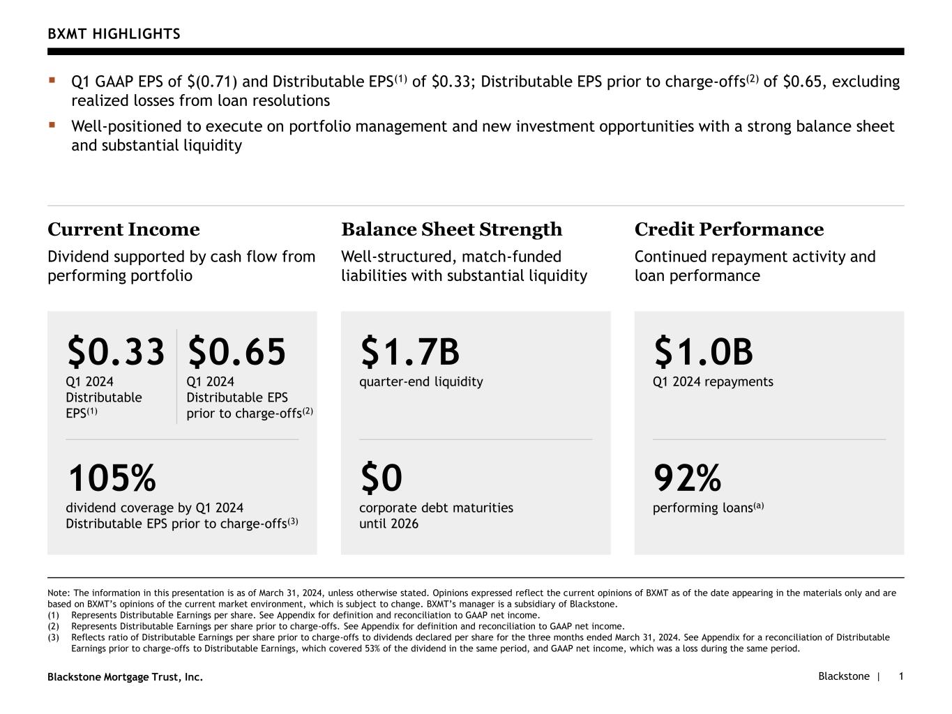 Blackstone |Blackstone Mortgage Trust, Inc. BXMT HIGHLIGHTS Note: The information in this presentation is as of March 31, 2024, unless otherwise stated. Opinions expressed reflect the current opinions of BXMT as of the date appearing in the materials only and are based on BXMT’s opinions of the current market environment, which is subject to change. BXMT’s manager is a subsidiary of Blackstone. (1) Represents Distributable Earnings per share. See Appendix for definition and reconciliation to GAAP net income. (2) Represents Distributable Earnings per share prior to charge-offs. See Appendix for definition and reconciliation to GAAP net income. (3) Reflects ratio of Distributable Earnings per share prior to charge-offs to dividends declared per share for the three months ended March 31, 2024. See Appendix for a reconciliation of Distributable Earnings prior to charge-offs to Distributable Earnings, which covered 53% of the dividend in the same period, and GAAP net income, which was a loss during the same period. 1 ▪ Q1 GAAP EPS of $(0.71) and Distributable EPS(1) of $0.33; Distributable EPS prior to charge-offs(2) of $0.65, excluding realized losses from loan resolutions ▪ Well-positioned to execute on portfolio management and new investment opportunities with a strong balance sheet and substantial liquidity Current Income Dividend supported by cash flow from performing portfolio Balance Sheet Strength Well-structured, match-funded liabilities with substantial liquidity Credit Performance Continued repayment activity and loan performance $0.33 Q1 2024 Distributable EPS(1) $1.7B quarter-end liquidity $1.0B Q1 2024 repayments 105% dividend coverage by Q1 2024 Distributable EPS prior to charge-offs(3) $0 corporate debt maturities until 2026 92% performing loans(a) $0.65 Q1 2024 Distributable EPS prior to charge-offs(2)