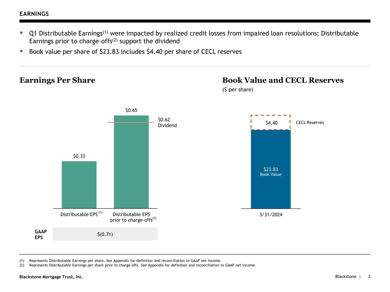 Blackstone |Blackstone Mortgage Trust, Inc. FIRST QUARTER RESULTS (1) Represents Distributable Earnings per share. See Appendix for definition and reconciliation to GAAP net income. (2) Represents Distributable Earnings per share prior to charge-offs. See Appendix for definition and reconciliation to GAAP net income. 2 ▪ Q1 GAAP basic loss per share of $(0.71), Distributable Earnings(1) per share of $0.33, and Distributable EPS prior to charge-offs(2) of $0.65 ▪ Book value per share of $23.83 includes $4.40 per share of CECL reserves ▪ Paid Q1 dividend of $0.62 per share, equating to a 13.0% annualized dividend yield(b) Earnings ▪ $21.1B portfolio(a) of 173 senior loans, collateralized by institutional quality real estate and diversified across sectors and markets; weighted-average origination LTV of 63%(c) ▪ Collected $1.0B of repayments in Q1 (56% US office), which exceeded loan fundings of $353M ▪ Resolved four 5-risk rated loans in Q1, including two asset sales, one deed-in-lieu, and one restructuring Portfolio ▪ 92% portfolio performance;(a) multifamily loans are 100% performing ▪ Upgraded 9 loans and downgraded 13 loans in Q1, with a weighted-average risk rating of 3.0 at quarter-end; recorded $174M net increase in CECL reserve ▪ Received over $300M of incremental borrower equity commitments in Q1 and $1.5B over the last twelve months; negotiated $86M of paydowns from loan modifications in Q1 (11% of OPB, on average) Credit ▪ Stable, match-funded financing structures with no capital markets mark-to-market provisions and no corporate debt maturities until 2026 ▪ Maintained strong liquidity of $1.7B; debt-to-equity(d) stable year-over-year at 3.8x ▪ Repurchased $26M of Senior Secured Notes at 88% of par in Q1’24 ($3M realized gain); $60M of total repurchases over the last twelve months have generated $8M of realized gains Capitalization and Liquidity