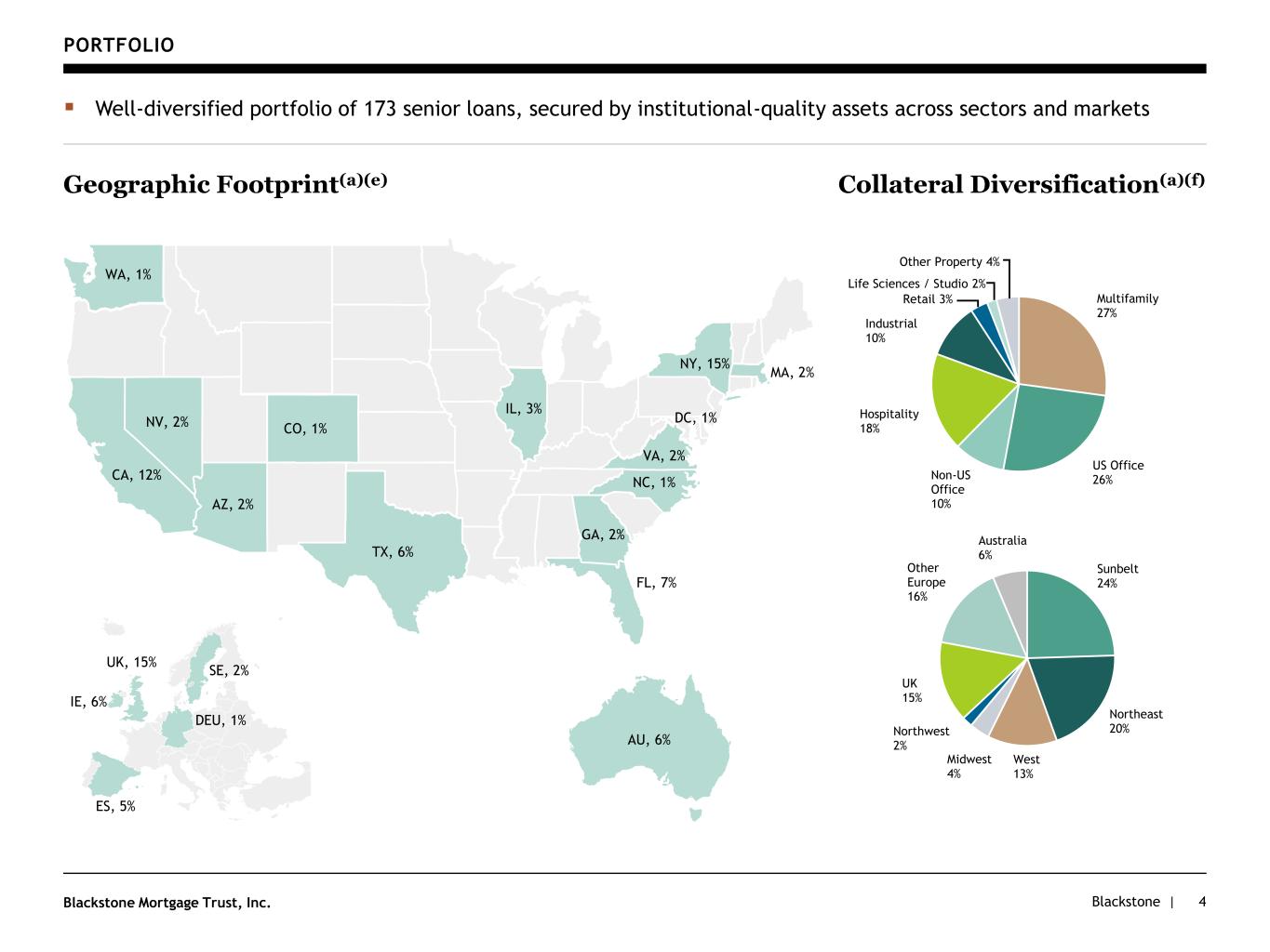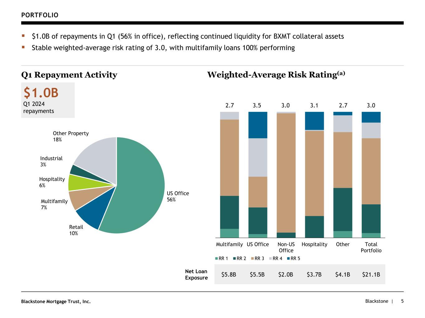 Blackstone |Blackstone Mortgage Trust, Inc. PORTFOLIO 4 ▪ Well-diversified portfolio of 173 senior loans, secured by institutional-quality assets across sectors and markets Collateral Diversification(a)(f) AU, 6% ES, 5% IE, 6% UK, 15% SE, 2% DEU, 1% Geographic Footprint(a)(e) DC, 1% TX, 6% NY, 15% NV, 2% MA, 2% IL, 3% GA, 2% FL, 7% CA, 12% VA, 2% AZ, 2% CO, 1% NC, 1% WA, 1% Sunbelt 24% Northeast 20% West 13% Midwest 4% Northwest 2% UK 15% Other Europe 16% Australia 6% Multifamily 27% US Office 26%Non-US Office 10% Hospitality 18% Industrial 10% Retail 3% Life Sciences / Studio 2% Other Property 4%