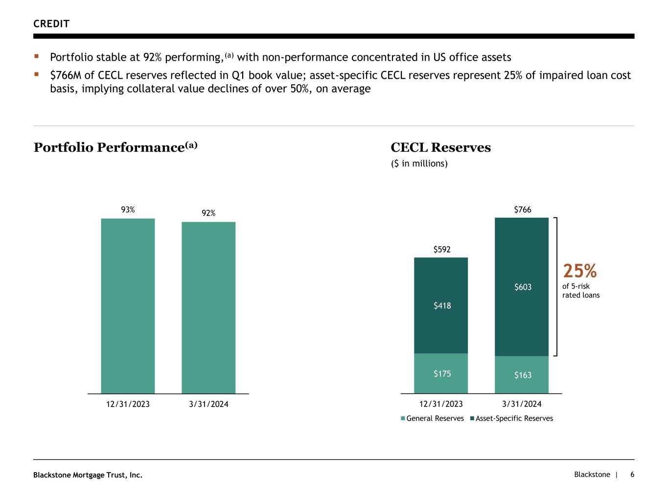Blackstone |Blackstone Mortgage Trust, Inc. $175 $163 $418 $603 12/31/2023 3/31/2024 General Reserves Asset-Specific Reserves CREDIT 6 ▪ Portfolio stable at 92% performing,(a) with non-performance concentrated in US office assets ▪ $766M of CECL reserves reflected in Q1 book value; asset-specific CECL reserves represent 25% of impaired loan cost basis, implying collateral value declines of over 50%, on average CECL Reserves ($ in millions) $592 $766 25% of 5-risk rated loans Portfolio Performance(a) 93% 92% 12/31/2023 3/31/2024