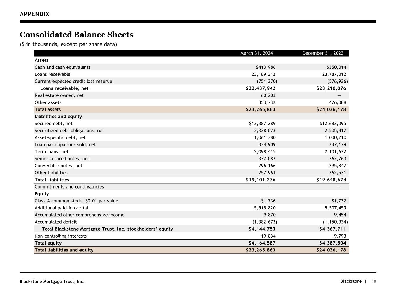 Blackstone |Blackstone Mortgage Trust, Inc. APPENDIX 10 Consolidated Balance Sheets ($ in thousands, except per share data) March 31, 2024 December 31, 2023 Assets Cash and cash equivalents $413,986 $350,014 Loans receivable 23,189,312 23,787,012 Current expected credit loss reserve (751,370) (576,936) Loans receivable, net $22,437,942 $23,210,076 Real estate owned, net 60,203 — Other assets 353,732 476,088 Total assets $23,265,863 $24,036,178 Liabilities and equity Secured debt, net $12,387,289 $12,683,095 Securitized debt obligations, net 2,328,073 2,505,417 Asset-specific debt, net 1,061,380 1,000,210 Loan participations sold, net 334,909 337,179 Term loans, net 2,098,415 2,101,632 Senior secured notes, net 337,083 362,763 Convertible notes, net 296,166 295,847 Other liabilities 257,961 362,531 Total Liabilities $19,101,276 $19,648,674 Commitments and contingencies — — Equity Class A common stock, $0.01 par value $1,736 $1,732 Additional paid-in capital 5,515,820 5,507,459 Accumulated other comprehensive income 9,870 9,454 Accumulated deficit (1,382,673) (1,150,934) Total Blackstone Mortgage Trust, Inc. stockholders’ equity $4,144,753 $4,367,711 Non-controlling interests 19,834 19,793 Total equity $4,164,587 $4,387,504 Total liabilities and equity $23,265,863 $24,036,178