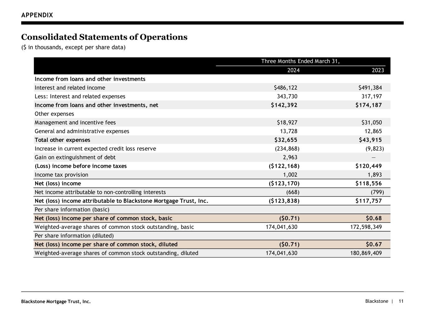 Blackstone |Blackstone Mortgage Trust, Inc. APPENDIX 11 Consolidated Statements of Operations ($ in thousands, except per share data) 2024 2023 Income from loans and other investments Interest and related income $486,122 $491,384 Less: Interest and related expenses 343,730 317,197 Income from loans and other investments, net $142,392 $174,187 Other expenses Management and incentive fees $18,927 $31,050 General and administrative expenses 13,728 12,865 Total other expenses $32,655 $43,915 Increase in current expected credit loss reserve (234,868) (9,823) Gain on extinguishment of debt 2,963 — (Loss) income before income taxes ($122,168) $120,449 Income tax provision 1,002 1,893 Net (loss) income ($123,170) $118,556 Net income attributable to non-controlling interests (668) (799) Net (loss) income attributable to Blackstone Mortgage Trust, Inc. ($123,838) $117,757 Per share information (basic) Net (loss) income per share of common stock, basic ($0.71) $0.68 Weighted-average shares of common stock outstanding, basic 174,041,630 172,598,349 Per share information (diluted) Net (loss) income per share of common stock, diluted ($0.71) $0.67 Weighted-average shares of common stock outstanding, diluted 174,041,630 180,869,409 Three Months Ended March 31,