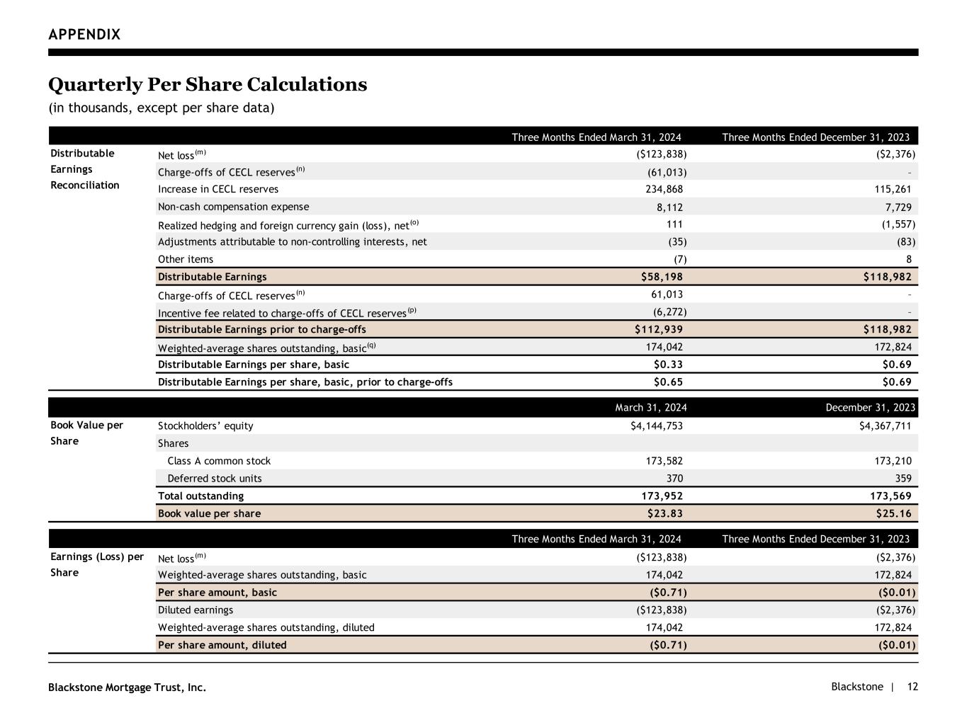 Blackstone |Blackstone Mortgage Trust, Inc. APPENDIX 12 Quarterly Per Share Calculations (in thousands, except per share data) Three Months Ended March 31, 2024 Three Months Ended December 31, 2023 Net loss(m) ($123,838) ($2,376) Charge-offs of CECL reserves (n) (61,013) – Increase in CECL reserves 234,868 115,261 Non-cash compensation expense 8,112 7,729 Realized hedging and foreign currency gain (loss), net(o) 111 (1,557) Adjustments attributable to non-controlling interests, net (35) (83) Other items (7) 8 Distributable Earnings $58,198 $118,982 Charge-offs of CECL reserves (n) 61,013 – Incentive fee related to charge-offs of CECL reserves (p) (6,272) – Distributable Earnings prior to charge-offs $112,939 $118,982 Weighted-average shares outstanding, basic(q) 174,042 172,824 Distributable Earnings per share, basic $0.33 $0.69 Distributable Earnings per share, basic, prior to charge-offs $0.65 $0.69 March 31, 2024 December 31, 2023 Stockholders’ equity $4,144,753 $4,367,711 Shares Class A common stock 173,582 173,210 Deferred stock units 370 359 Total outstanding 173,952 173,569 Book value per share $23.83 $25.16 Three Months Ended March 31, 2024 Three Months Ended December 31, 2023 Net loss(m) ($123,838) ($2,376) Weighted-average shares outstanding, basic 174,042 172,824 Per share amount, basic ($0.71) ($0.01) Diluted earnings ($123,838) ($2,376) Weighted-average shares outstanding, diluted 174,042 172,824 Per share amount, diluted ($0.71) ($0.01) Distributable Earnings Reconciliation Book Value per Share Earnings (Loss) per Share