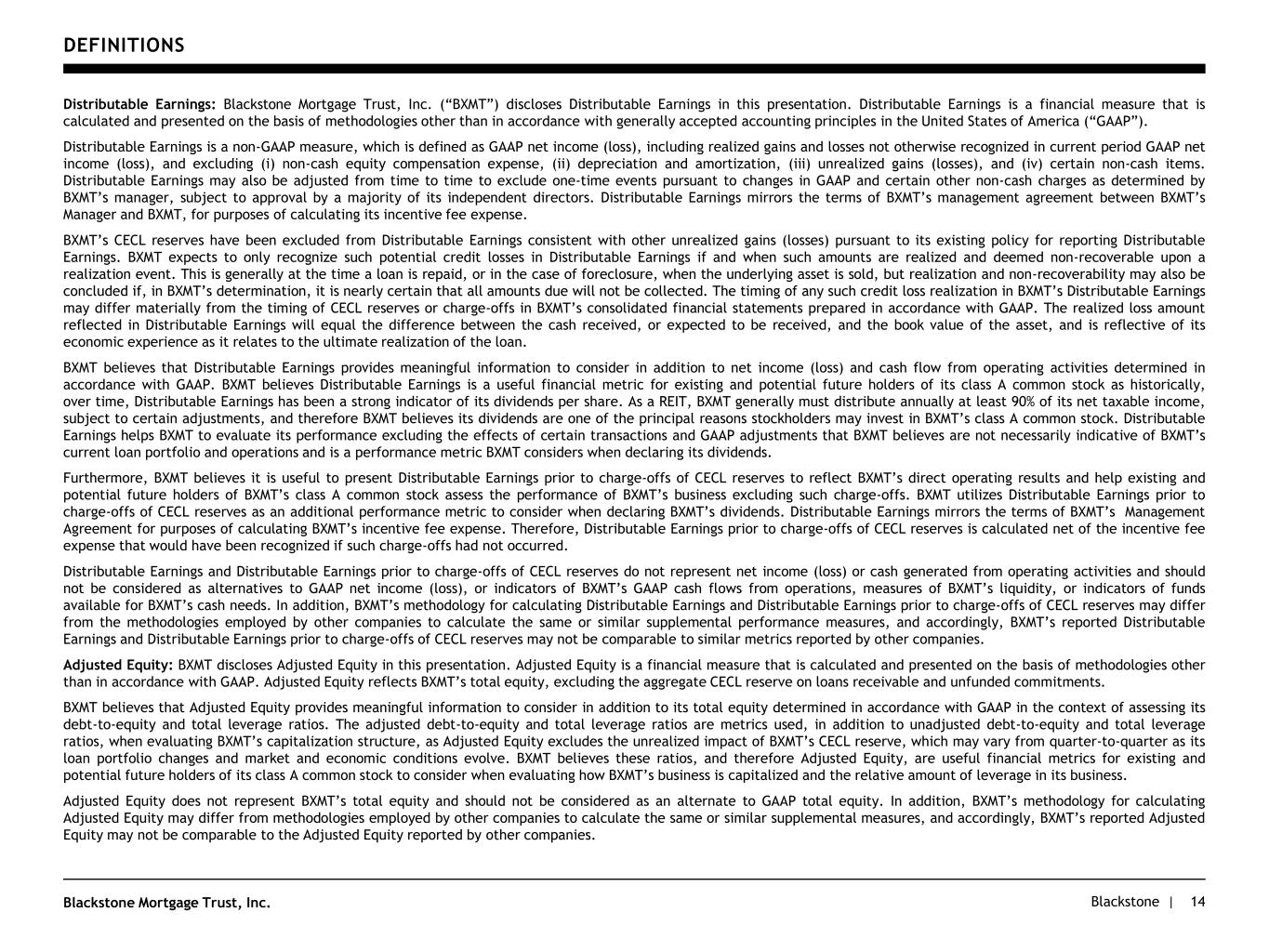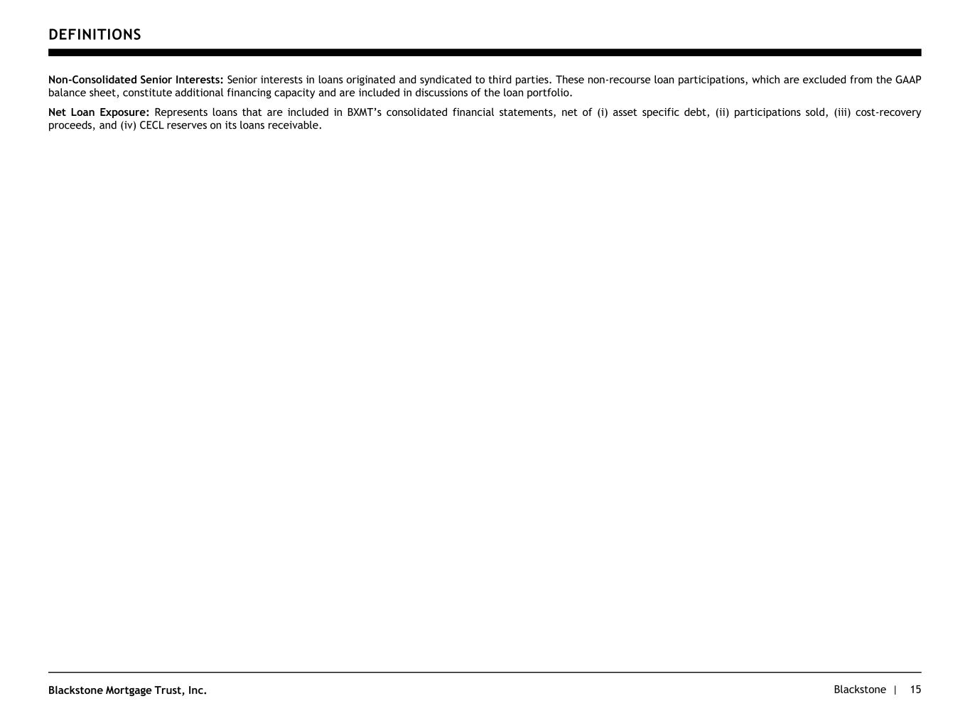Blackstone |Blackstone Mortgage Trust, Inc. DEFINITIONS 14 Distributable Earnings: Blackstone Mortgage Trust, Inc. (“BXMT”) discloses Distributable Earnings in this presentation. Distributable Earnings is a financial measure that is calculated and presented on the basis of methodologies other than in accordance with generally accepted accounting principles in the United States of America (“GAAP”). Distributable Earnings is a non-GAAP measure, which is defined as GAAP net income (loss), including realized gains and losses not otherwise recognized in current period GAAP net income (loss), and excluding (i) non-cash equity compensation expense, (ii) depreciation and amortization, (iii) unrealized gains (losses), and (iv) certain non-cash items. Distributable Earnings may also be adjusted from time to time to exclude one-time events pursuant to changes in GAAP and certain other non-cash charges as determined by BXMT’s manager, subject to approval by a majority of its independent directors. Distributable Earnings mirrors the terms of BXMT’s management agreement between BXMT’s Manager and BXMT, for purposes of calculating its incentive fee expense. BXMT’s CECL reserves have been excluded from Distributable Earnings consistent with other unrealized gains (losses) pursuant to its existing policy for reporting Distributable Earnings. BXMT expects to only recognize such potential credit losses in Distributable Earnings if and when such amounts are realized and deemed non-recoverable upon a realization event. This is generally at the time a loan is repaid, or in the case of foreclosure, when the underlying asset is sold, but realization and non-recoverability may also be concluded if, in BXMT’s determination, it is nearly certain that all amounts due will not be collected. The timing of any such credit loss realization in BXMT’s Distributable Earnings may differ materially from the timing of CECL reserves or charge-offs in BXMT’s consolidated financial statements prepared in accordance with GAAP. The realized loss amount reflected in Distributable Earnings will equal the difference between the cash received, or expected to be received, and the book value of the asset, and is reflective of its economic experience as it relates to the ultimate realization of the loan. BXMT believes that Distributable Earnings provides meaningful information to consider in addition to net income (loss) and cash flow from operating activities determined in accordance with GAAP. BXMT believes Distributable Earnings is a useful financial metric for existing and potential future holders of its class A common stock as historically, over time, Distributable Earnings has been a strong indicator of its dividends per share. As a REIT, BXMT generally must distribute annually at least 90% of its net taxable income, subject to certain adjustments, and therefore BXMT believes its dividends are one of the principal reasons stockholders may invest in BXMT’s class A common stock. Distributable Earnings helps BXMT to evaluate its performance excluding the effects of certain transactions and GAAP adjustments that BXMT believes are not necessarily indicative of BXMT’s current loan portfolio and operations and is a performance metric BXMT considers when declaring its dividends. Furthermore, BXMT believes it is useful to present Distributable Earnings prior to charge-offs of CECL reserves to reflect BXMT’s direct operating results and help existing and potential future holders of BXMT’s class A common stock assess the performance of BXMT’s business excluding such charge-offs. BXMT utilizes Distributable Earnings prior to charge-offs of CECL reserves as an additional performance metric to consider when declaring BXMT’s dividends. Distributable Earnings mirrors the terms of BXMT’s Management Agreement for purposes of calculating BXMT’s incentive fee expense. Therefore, Distributable Earnings prior to charge-offs of CECL reserves is calculated net of the incentive fee expense that would have been recognized if such charge-offs had not occurred. Distributable Earnings and Distributable Earnings prior to charge-offs of CECL reserves do not represent net income (loss) or cash generated from operating activities and should not be considered as alternatives to GAAP net income (loss), or indicators of BXMT’s GAAP cash flows from operations, measures of BXMT’s liquidity, or indicators of funds available for BXMT’s cash needs. In addition, BXMT’s methodology for calculating Distributable Earnings and Distributable Earnings prior to charge-offs of CECL reserves may differ from the methodologies employed by other companies to calculate the same or similar supplemental performance measures, and accordingly, BXMT’s reported Distributable Earnings and Distributable Earnings prior to charge-offs of CECL reserves may not be comparable to similar metrics reported by other companies. Adjusted Equity: BXMT discloses Adjusted Equity in this presentation. Adjusted Equity is a financial measure that is calculated and presented on the basis of methodologies other than in accordance with GAAP. Adjusted Equity reflects BXMT’s total equity, excluding the aggregate CECL reserve on loans receivable and unfunded commitments. BXMT believes that Adjusted Equity provides meaningful information to consider in addition to its total equity determined in accordance with GAAP in the context of assessing its debt-to-equity and total leverage ratios. The adjusted debt-to-equity and total leverage ratios are metrics used, in addition to unadjusted debt-to-equity and total leverage ratios, when evaluating BXMT’s capitalization structure, as Adjusted Equity excludes the unrealized impact of BXMT’s CECL reserve, which may vary from quarter-to-quarter as its loan portfolio changes and market and economic conditions evolve. BXMT believes these ratios, and therefore Adjusted Equity, are useful financial metrics for existing and pote