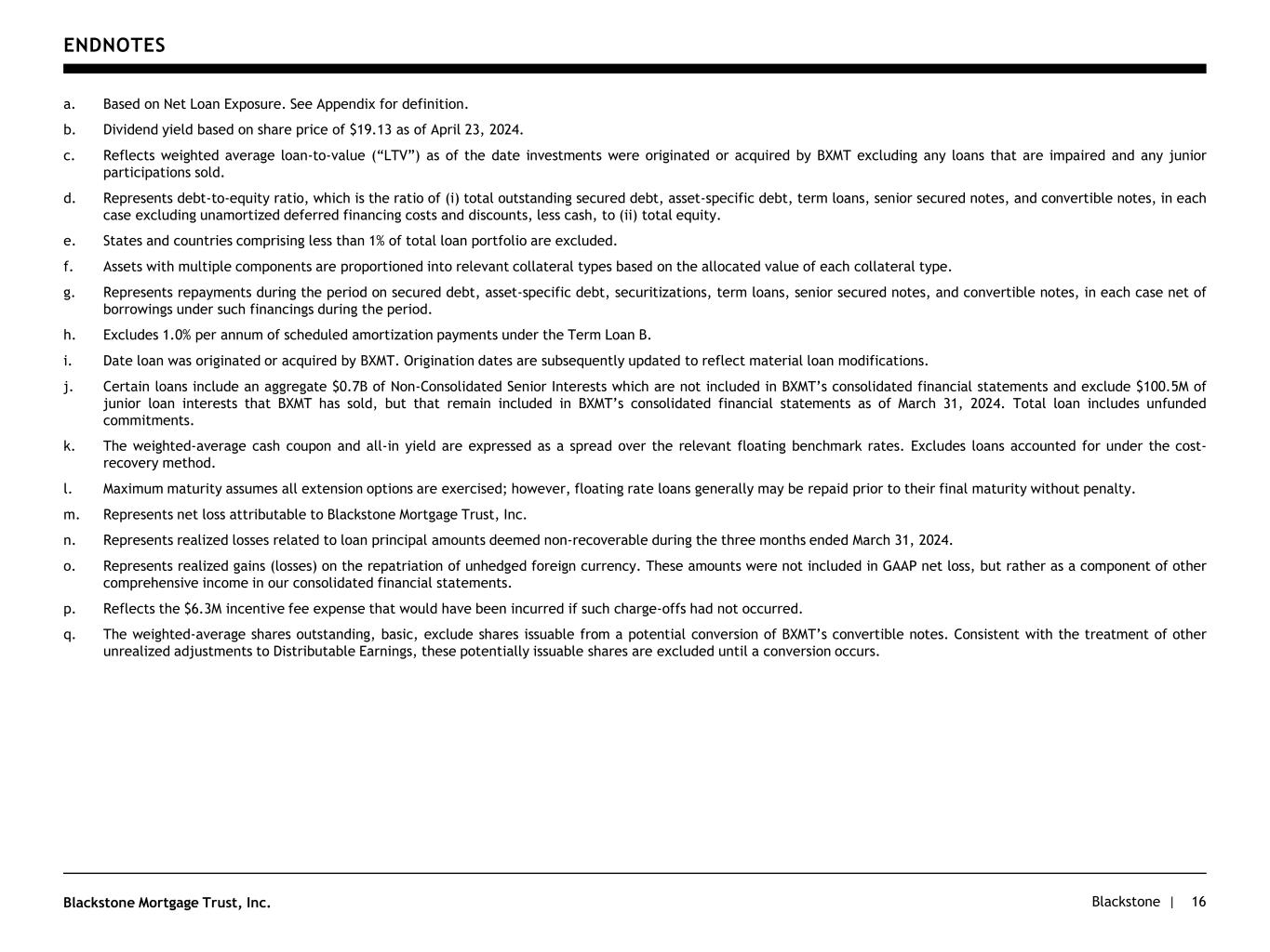 Blackstone |Blackstone Mortgage Trust, Inc. DEFINITIONS 15 Non-Consolidated Senior Interests: Senior interests in loans originated and syndicated to third parties. These non-recourse loan participations, which are excluded from the GAAP balance sheet, constitute additional financing capacity and are included in discussions of the loan portfolio. Net Loan Exposure: Represents loans that are included in BXMT’s consolidated financial statements, net of (i) asset specific debt, (ii) participations sold, (iii) cost-recovery proceeds, and (iv) CECL reserves on its loans receivable.