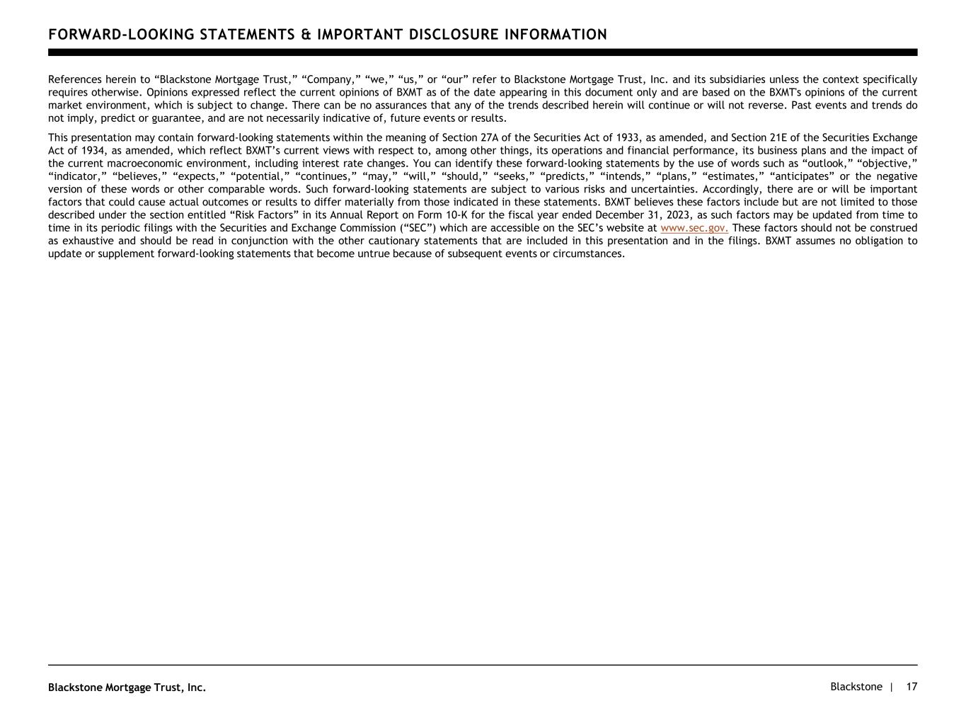 Blackstone |Blackstone Mortgage Trust, Inc. ENDNOTES 16 a. Based on Net Loan Exposure. See Appendix for definition. b. Dividend yield based on share price of $19.13 as of April 23, 2024. c. Reflects weighted average loan-to-value (“LTV”) as of the date investments were originated or acquired by BXMT excluding any loans that are impaired and any junior participations sold. d. Represents debt-to-equity ratio, which is the ratio of (i) total outstanding secured debt, asset-specific debt, term loans, senior secured notes, and convertible notes, in each case excluding unamortized deferred financing costs and discounts, less cash, to (ii) total equity. e. States and countries comprising less than 1% of total loan portfolio are excluded. f. Assets with multiple components are proportioned into relevant collateral types based on the allocated value of each collateral type. g. Represents repayments during the period on secured debt, asset-specific debt, securitizations, term loans, senior secured notes, and convertible notes, in each case net of borrowings under such financings during the period. h. Excludes 1.0% per annum of scheduled amortization payments under the Term Loan B. i. Date loan was originated or acquired by BXMT. Origination dates are subsequently updated to reflect material loan modifications. j. Certain loans include an aggregate $0.7B of Non-Consolidated Senior Interests which are not included in BXMT’s consolidated financial statements and exclude $100.5M of junior loan interests that BXMT has sold, but that remain included in BXMT’s consolidated financial statements as of March 31, 2024. Total loan includes unfunded commitments. k. The weighted-average cash coupon and all-in yield are expressed as a spread over the relevant floating benchmark rates. Excludes loans accounted for under the cost- recovery method. l. Maximum maturity assumes all extension options are exercised; however, floating rate loans generally may be repaid prior to their final maturity without penalty. m. Represents net loss attributable to Blackstone Mortgage Trust, Inc. n. Represents realized losses related to loan principal amounts deemed non-recoverable during the three months ended March 31, 2024. o. Represents realized gains (losses) on the repatriation of unhedged foreign currency. These amounts were not included in GAAP net loss, but rather as a component of other comprehensive income in our consolidated financial statements. p. Reflects the $6.3M incentive fee expense that would have been incurred if such charge-offs had not occurred. q. The weighted-average shares outstanding, basic, exclude shares issuable from a potential conversion of BXMT’s convertible notes. Consistent with the treatment of other unrealized adjustments to Distributable Earnings, these potentially issuable shares are excluded until a conversion occurs.