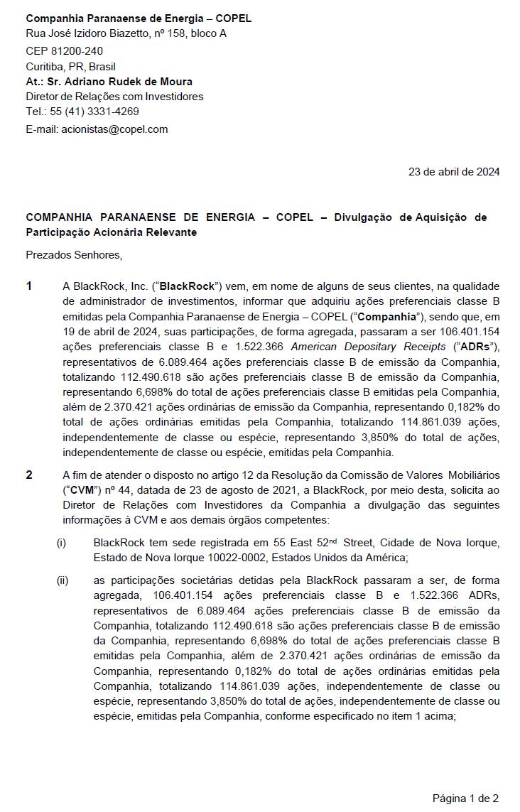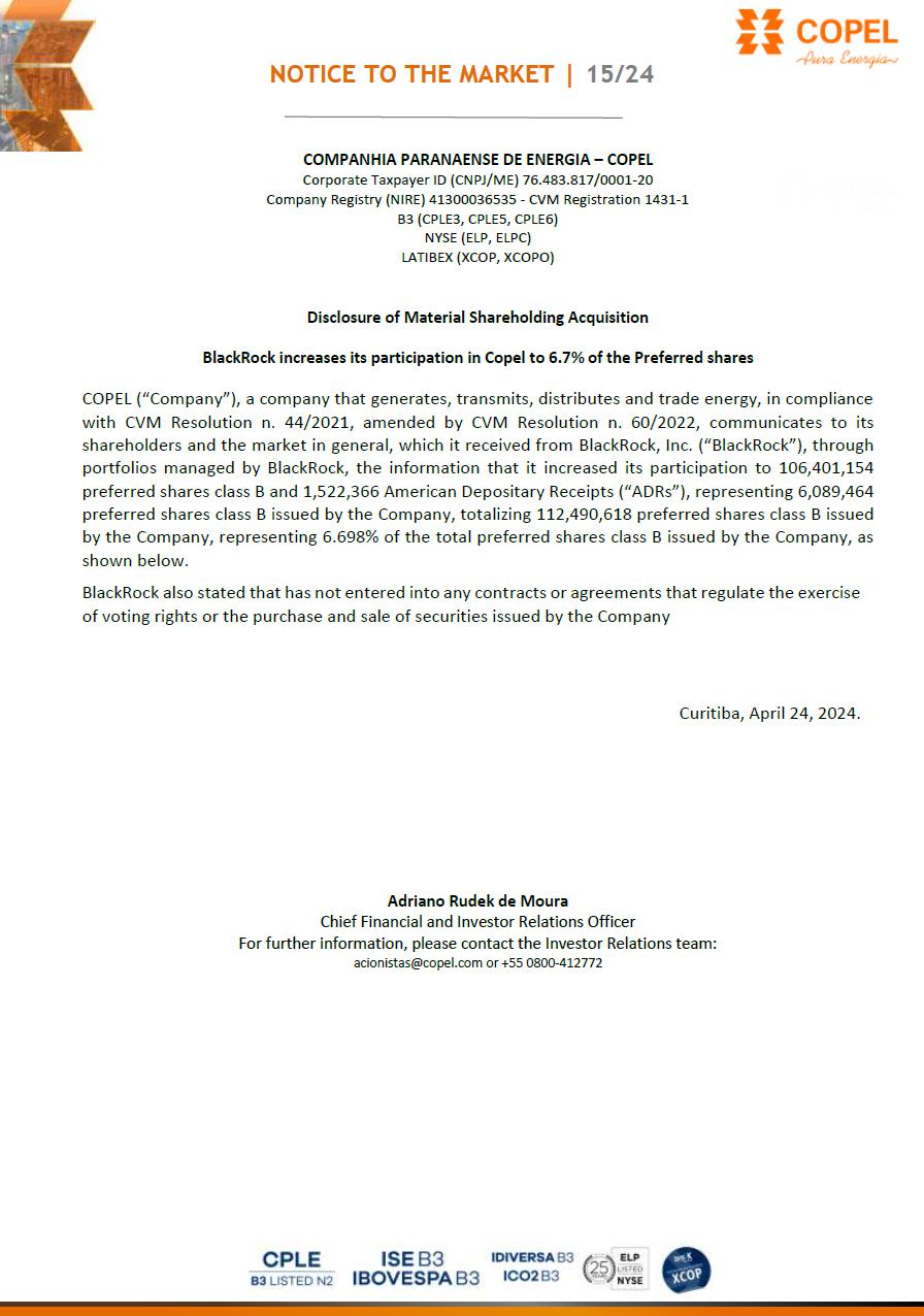 | COMPANHIA PARANAENSE DE ENERGIA – COPEL | ||
