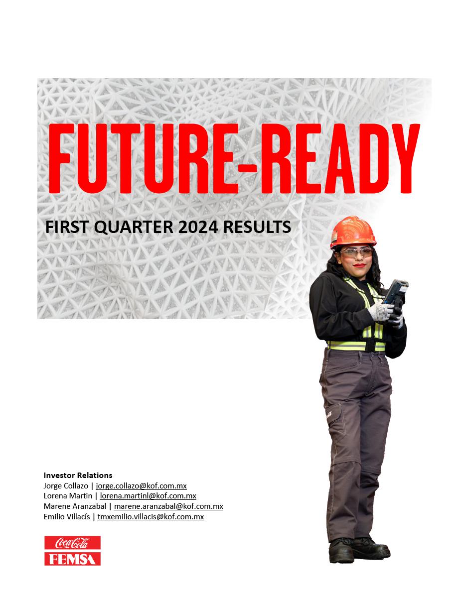 Mexico City, April 24, 2024, Coca-Cola FEMSA, S.A.B. de C.V. (BMV: KOFUBL, NYSE: KOF) (“Coca-Cola FEMSA”, “KOF” or the “Company”), the largest Coca-Cola franchise bottler in the world by sales volume, announces results for the first quarter of 2024.