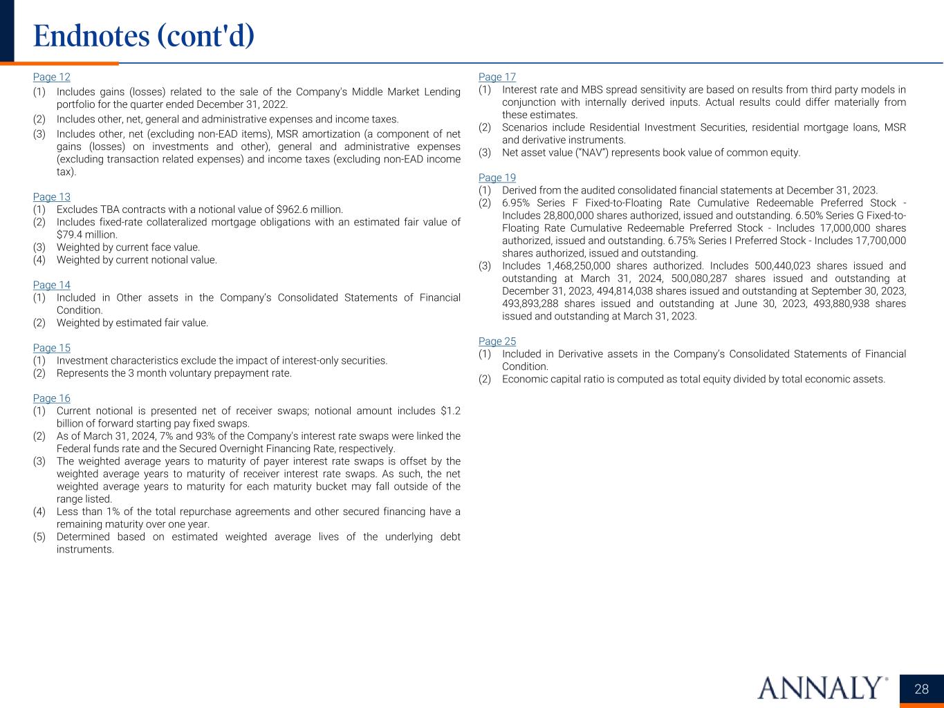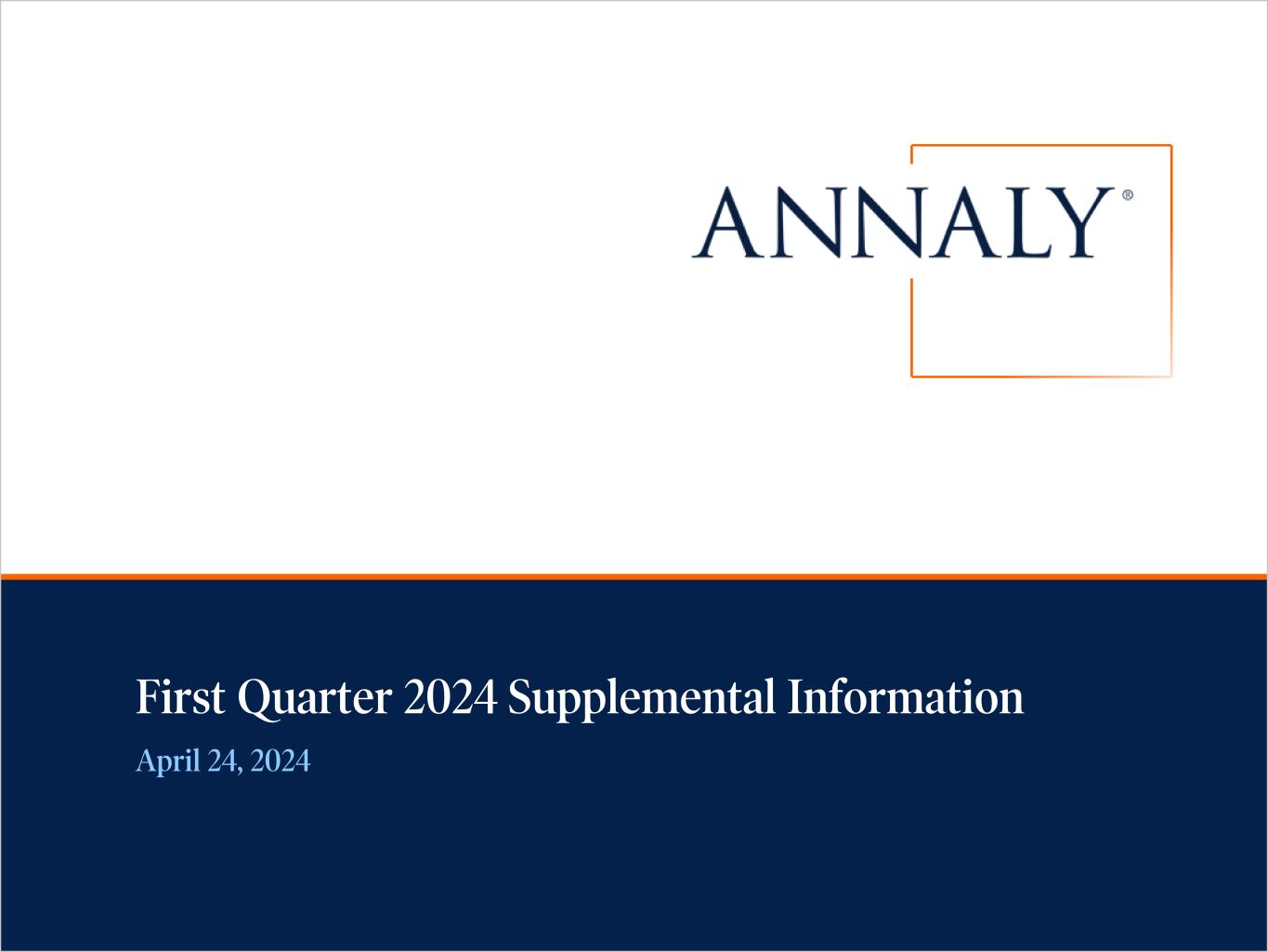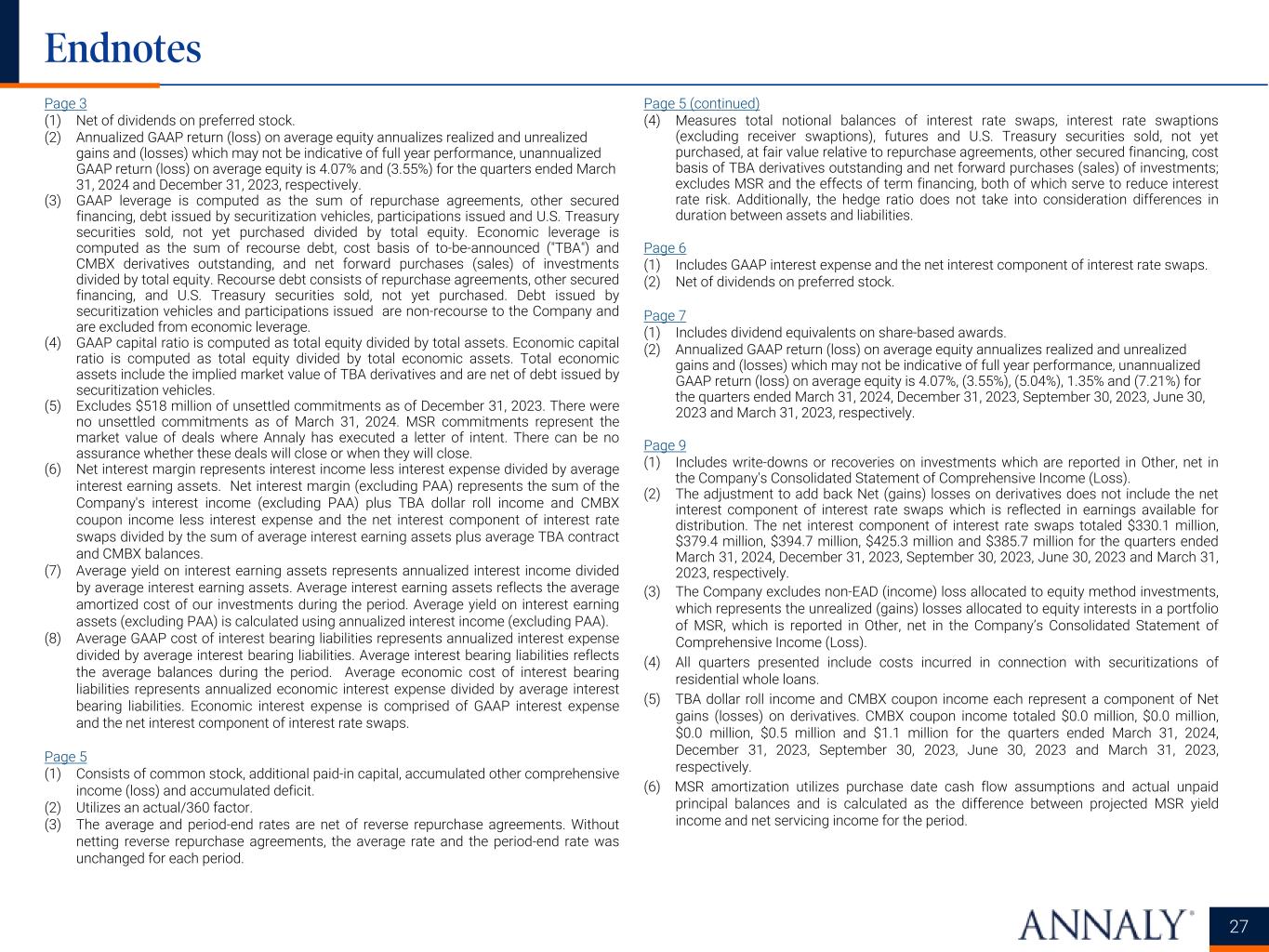 Page 3 (1) Net of dividends on preferred stock. (2) Annualized GAAP return (loss) on average equity annualizes realized and unrealized gains and (losses) which may not be indicative of full year performance, unannualized GAAP return (loss) on average equity is 4.07% and (3.55%) for the quarters ended March 31, 2024 and December 31, 2023, respectively. (3) GAAP leverage is computed as the sum of repurchase agreements, other secured financing, debt issued by securitization vehicles, participations issued and U.S. Treasury securities sold, not yet purchased divided by total equity. Economic leverage is computed as the sum of recourse debt, cost basis of to-be-announced ("TBA") and CMBX derivatives outstanding, and net forward purchases (sales) of investments divided by total equity. Recourse debt consists of repurchase agreements, other secured financing, and U.S. Treasury securities sold, not yet purchased. Debt issued by securitization vehicles and participations issued are non-recourse to the Company and are excluded from economic leverage. (4) GAAP capital ratio is computed as total equity divided by total assets. Economic capital ratio is computed as total equity divided by total economic assets. Total economic assets include the implied market value of TBA derivatives and are net of debt issued by securitization vehicles. (5) Excludes $518 million of unsettled commitments as of December 31, 2023. There were no unsettled commitments as of March 31, 2024. MSR commitments represent the market value of deals where Annaly has executed a letter of intent. There can be no assurance whether these deals will close or when they will close. (6) Net interest margin represents interest income less interest expense divided by average interest earning assets. Net interest margin (excluding PAA) represents the sum of the Company's interest income (excluding PAA) plus TBA dollar roll income and CMBX coupon income less interest expense and the net interest component of interest rate swaps divided by the sum of average interest earning assets plus average TBA contract and CMBX balances. (7) Average yield on interest earning assets represents annualized interest income divided by average interest earning assets. Average interest earning assets reflects the average amortized cost of our investments during the period. Average yield on interest earning assets (excluding PAA) is calculated using annualized interest income (excluding PAA). (8) Average GAAP cost of interest bearing liabilities represents annualized interest expense divided by average interest bearing liabilities. Average interest bearing liabilities reflects the average balances during the period. Average economic cost of interest bearing liabilities represents annualized economic interest expense divided by average interest bearing liabilities. Economic interest expense is comprised of GAAP interest expense and the net interest component of interest rate swaps. Page 5 (1) Consists of common stock, additional paid-in capital, accumulated other comprehensive income (loss) and accumulated deficit. (2) Utilizes an actual/360 factor. (3) The average and period-end rates are net of reverse repurchase agreements. Without netting reverse repurchase agreements, the average rate and the period-end rate was unchanged for each period. Page 5 (continued) (4) Measures total notional balances of interest rate swaps, interest rate swaptions (excluding receiver swaptions), futures and U.S. Treasury securities sold, not yet purchased, at fair value relative to repurchase agreements, other secured financing, cost basis of TBA derivatives outstanding and net forward purchases (sales) of investments; excludes MSR and the effects of term financing, both of which serve to reduce interest rate risk. Additionally, the hedge ratio does not take into consideration differences in duration between assets and liabilities. Page 6 (1) Includes GAAP interest expense and the net interest component of interest rate swaps. (2) Net of dividends on preferred stock. Page 7 (1) Includes dividend equivalents on share-based awards. (2) Annualized GAAP return (loss) on average equity annualizes realized and unrealized gains and (losses) which may not be indicative of full year performance, unannualized GAAP return (loss) on average equity is 4.07%, (3.55%), (5.04%), 1.35% and (7.21%) for the quarters ended March 31, 2024, December 31, 2023, September 30, 2023, June 30, 2023 and March 31, 2023, respectively. Page 9 (1) Includes write-downs or recoveries on investments which are reported in Other, net in the Company's Consolidated Statement of Comprehensive Income (Loss). (2) The adjustment to add back Net (gains) losses on derivatives does not include the net interest component of interest rate swaps which is reflected in earnings available for distribution. The net interest component of interest rate swaps totaled $330.1 million, $379.4 million, $394.7 million, $425.3 million and $385.7 million for the quarters ended March 31, 2024, December 31, 2023, September 30, 2023, June 30, 2023 and March 31, 2023, respectively. (3) The Company excludes non-EAD (income) loss allocated to equity method investments, which represents the unrealized (gains) losses allocated to equity interests in a portfolio of MSR, which is reported in Other, net in the Company’s Consolidated Statement of Comprehensive Income (Loss). (4) All quarters presented include costs incurred in connection with securitizations of residential whole loans. (5) TBA dollar roll income and CMBX coupon income each represent a component of Net gains (losses) on derivatives. CMBX coupon income totaled $0.0 million, $0.0 million, $0.0 million, $0.5 million and $1.1 million for the quarters ended March 31, 2024, December 31, 2023, September 30, 2023, June 30, 2023 and March 31, 2023, respectively. (6) MSR amortization utilizes purchase date cash flow assumptions and actual unpaid principal balances and is calculated as the differenc