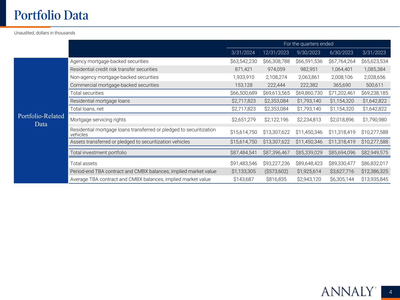 Portfolio-Related Data Portfolio Data For the quarters ended 3/31/2024 12/31/2023 9/30/2023 6/30/2023 3/31/2023 Agency mortgage-backed securities $63,542,230 $66,308,788 $66,591,536 $67,764,264 $65,623,534 Residential credit risk transfer securities 871,421 974,059 982,951 1,064,401 1,085,384 Non-agency mortgage-backed securities 1,933,910 2,108,274 2,063,861 2,008,106 2,028,656 Commercial mortgage-backed securities 153,128 222,444 222,382 365,690 500,611 Total securities $66,500,689 $69,613,565 $69,860,730 $71,202,461 $69,238,185 Residential mortgage loans $2,717,823 $2,353,084 $1,793,140 $1,154,320 $1,642,822 Total loans, net $2,717,823 $2,353,084 $1,793,140 $1,154,320 $1,642,822 Mortgage servicing rights $2,651,279 $2,122,196 $2,234,813 $2,018,896 $1,790,980 Residential mortgage loans transferred or pledged to securitization vehicles $15,614,750 $13,307,622 $11,450,346 $11,318,419 $10,277,588 Assets transferred or pledged to securitization vehicles $15,614,750 $13,307,622 $11,450,346 $11,318,419 $10,277,588 Total investment portfolio $87,484,541 $87,396,467 $85,339,029 $85,694,096 $82,949,575 Total assets $91,483,546 $93,227,236 $89,648,423 $89,330,477 $86,832,017 Period-end TBA contract and CMBX balances, implied market value $1,133,305 ($573,602) $1,925,614 $3,627,716 $12,386,325 Average TBA contract and CMBX balances, implied market value $143,687 $816,835 $2,943,120 $6,305,144 $13,935,845 Unaudited, dollars in thousands 4